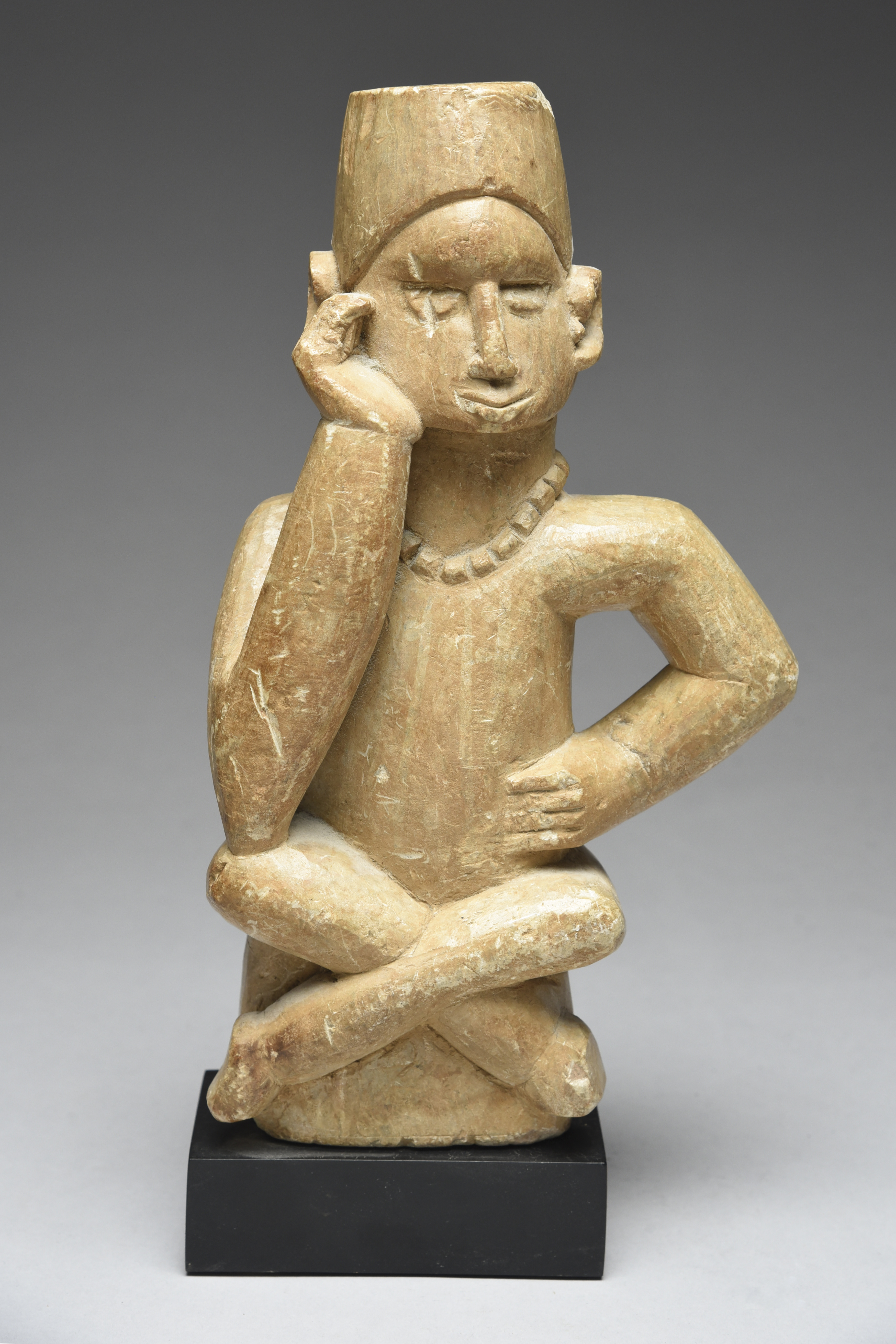 steatite, sitting crossed legged with one hand on the hip and the other supporting the right cheek, and wearing a necklace and a cap,