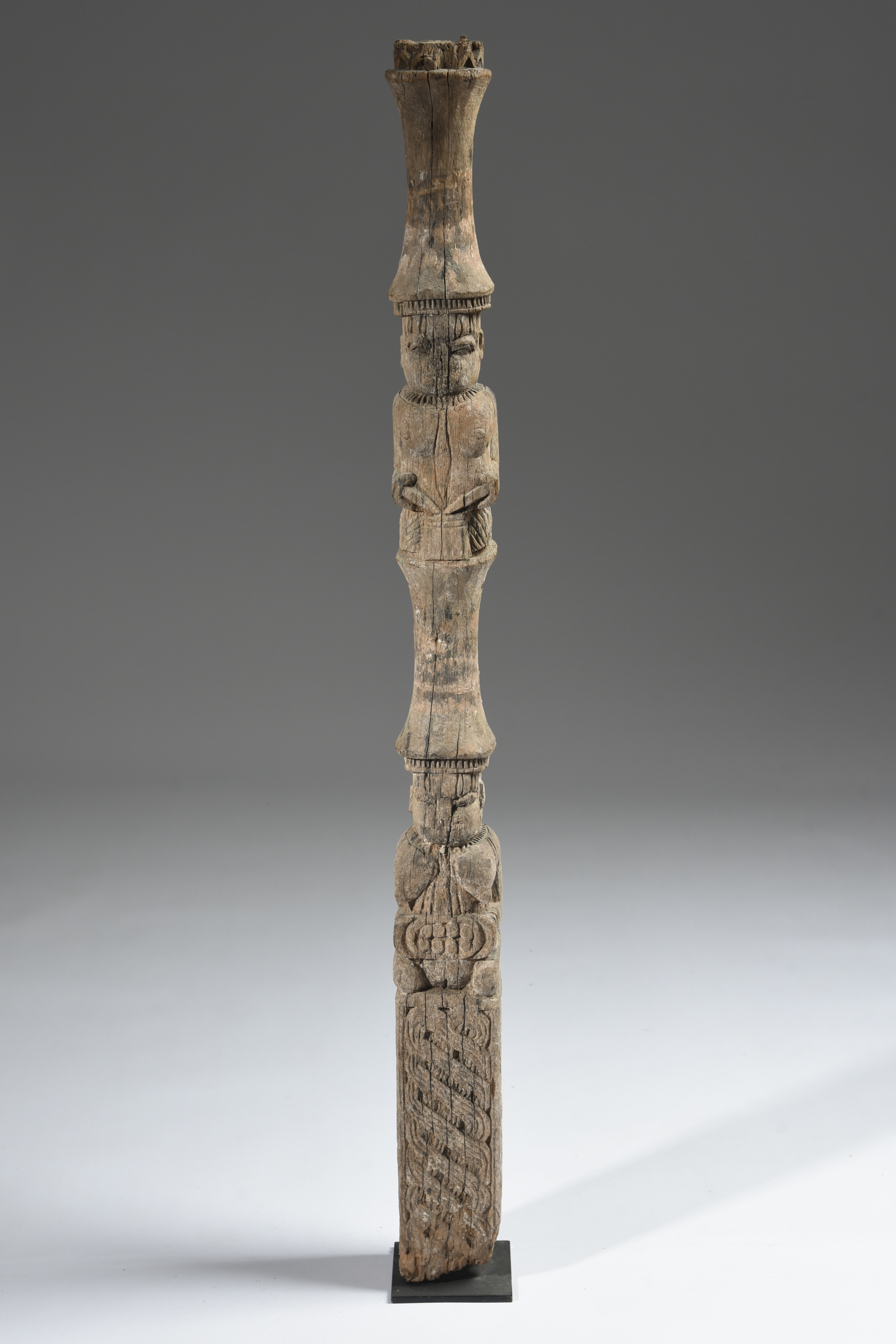 carved with interlaced symbols, a kneeling female figure holding a game board and a male drummer with waisted columns,