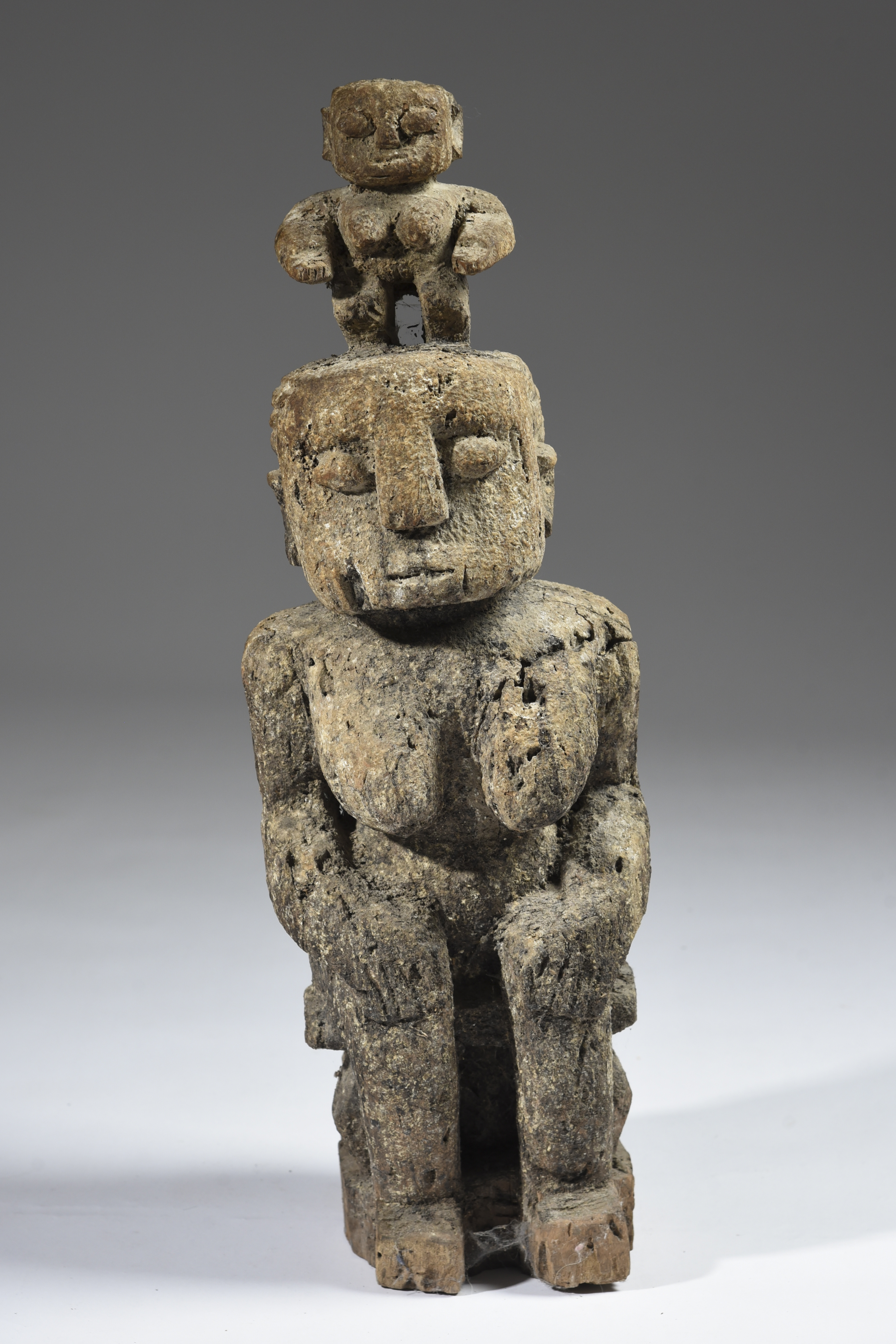 the female figure sitting on a stool, with an open back coiffure and with a smaller female figure on her head, with encrusted libations,