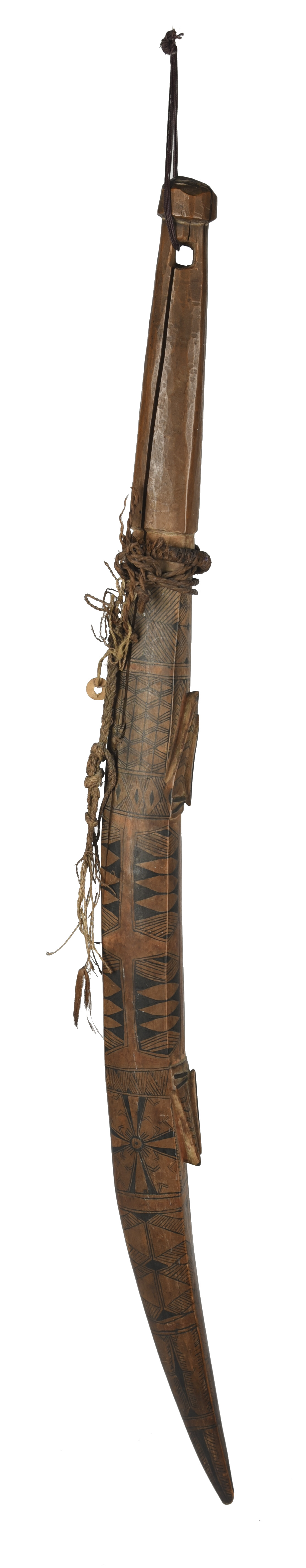 with fine geometric and fish decoration in black and red pigment, with remains of fibre binding and with a pierced attachment hole to the end of the knopped handle,