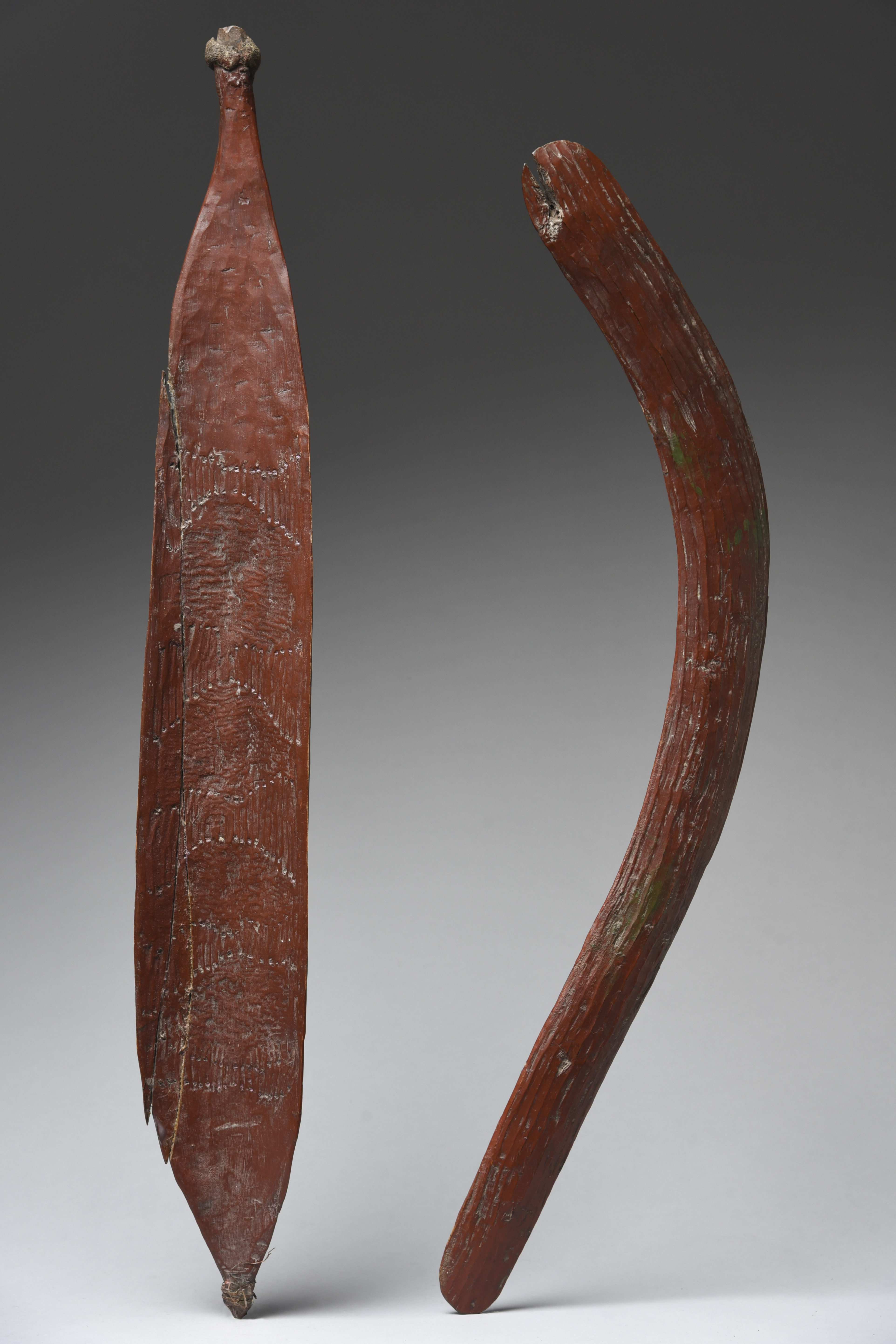 and an Aborigine boomerang, with grooves to one side and part grooved to the other, painted red, 66.5cm long. (2)