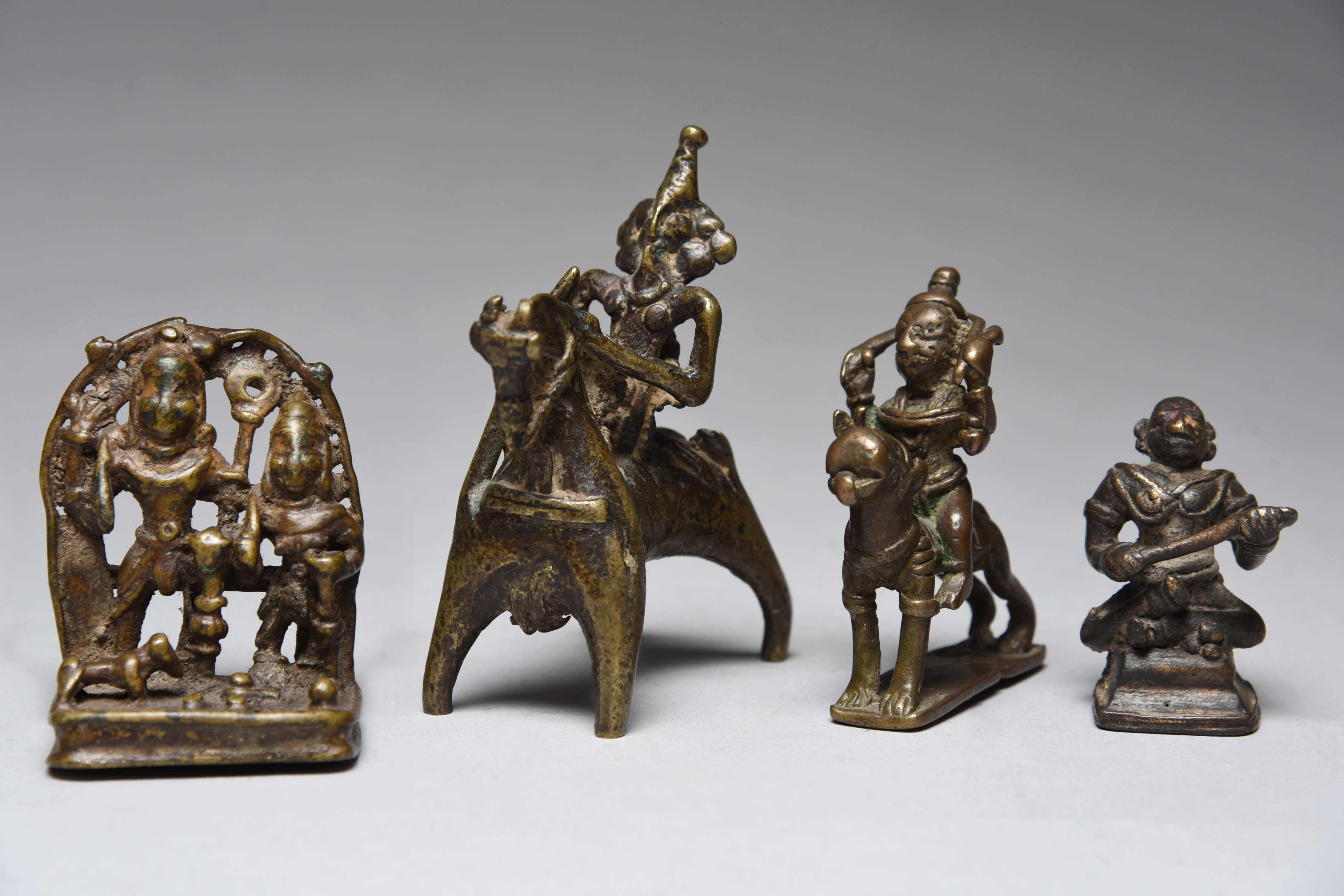 Including Durga astride a tiger, 6.5cm high, Annapurna, seated cross legged and holding a ladle, 4.7cm high, an equestrian group with the mounted figure holding a staff, 9cm high and a group representing Shiva and Parvati, 6cm high, all with bases. (8)