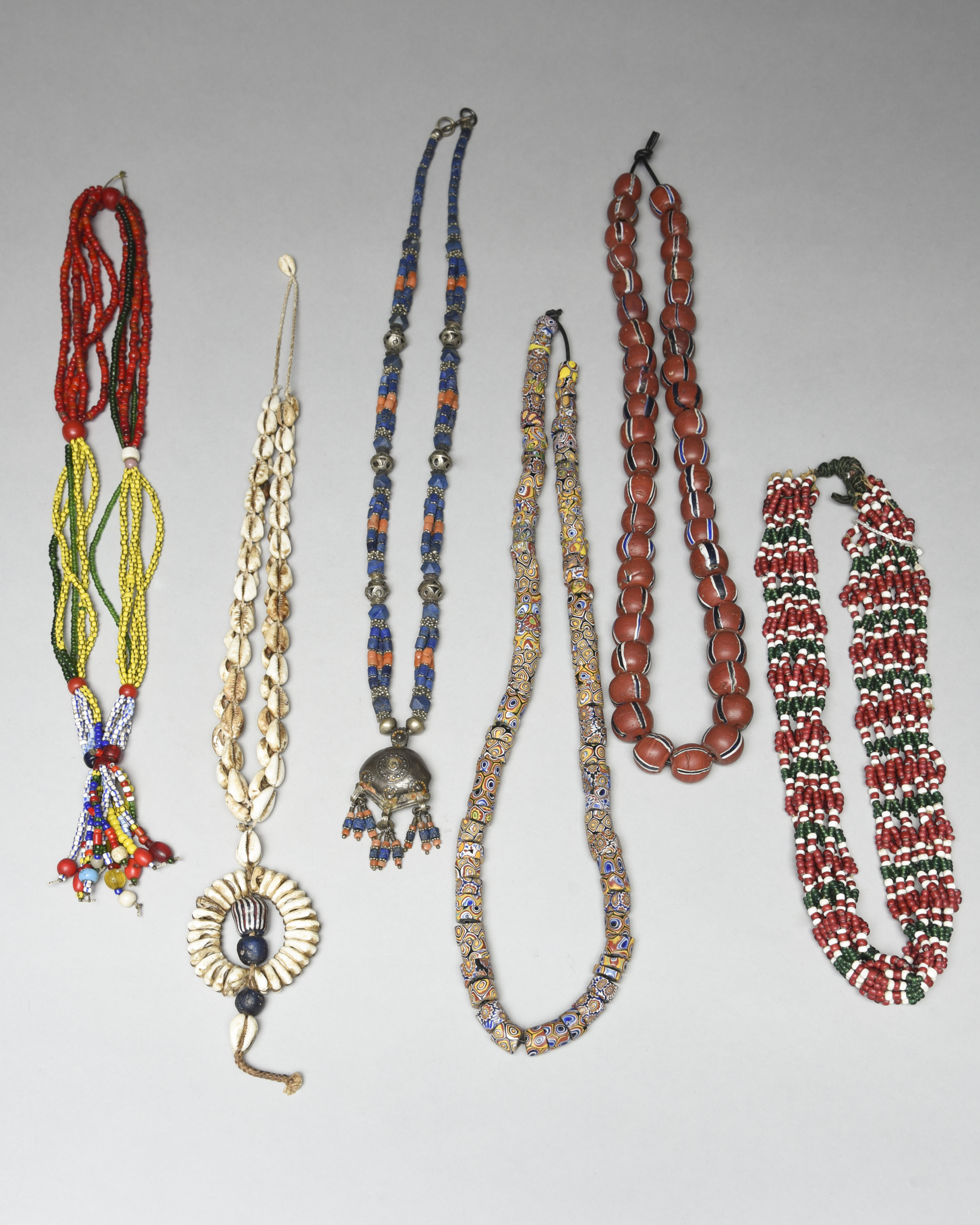 and five glass beads necklaces, Africa and Naga, one with metal beads and an amulet. (6)