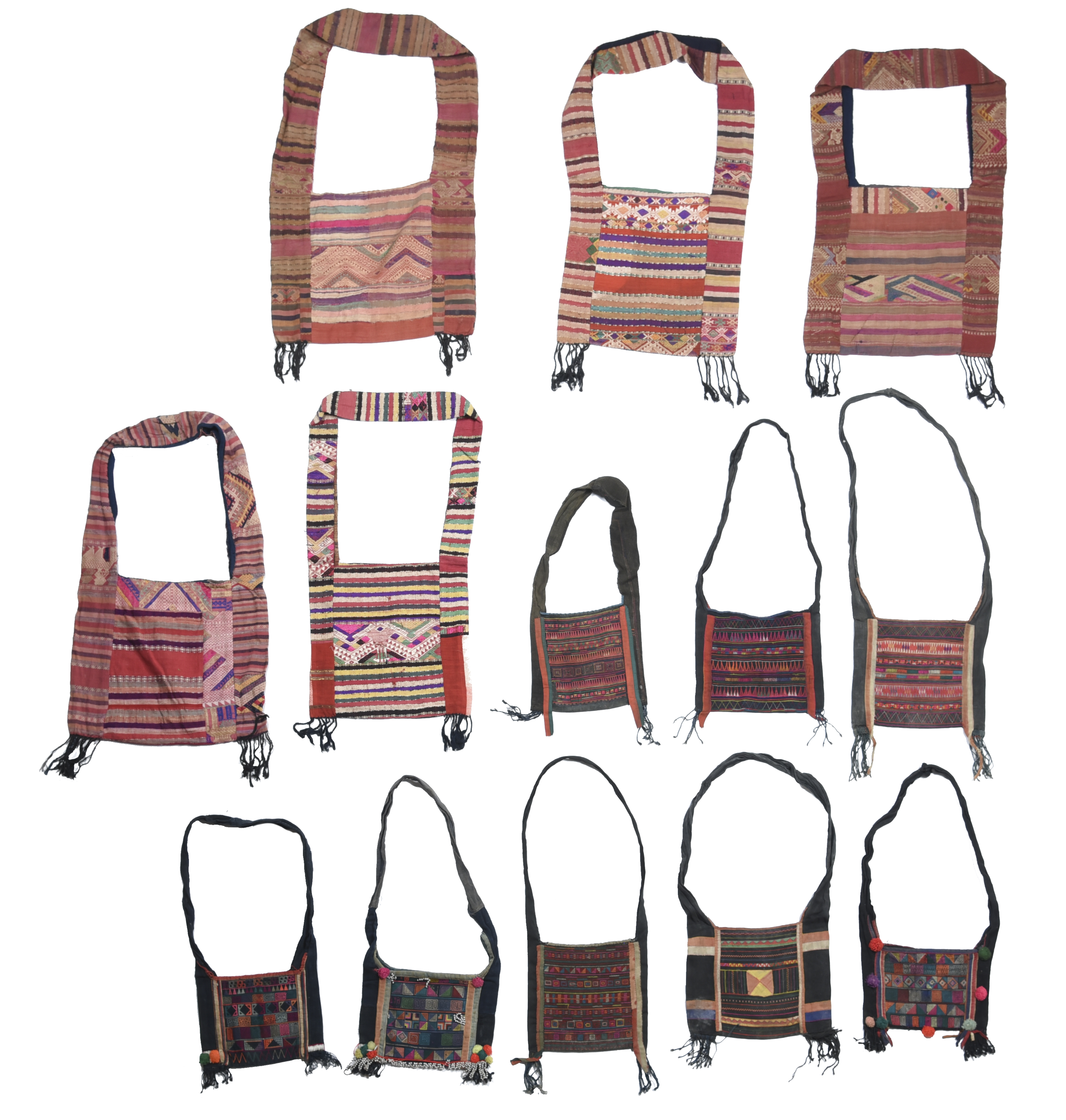with embroidered panel fronts and three with applique seeds or pom-poms, and five hand woven Laos bags yaam,
