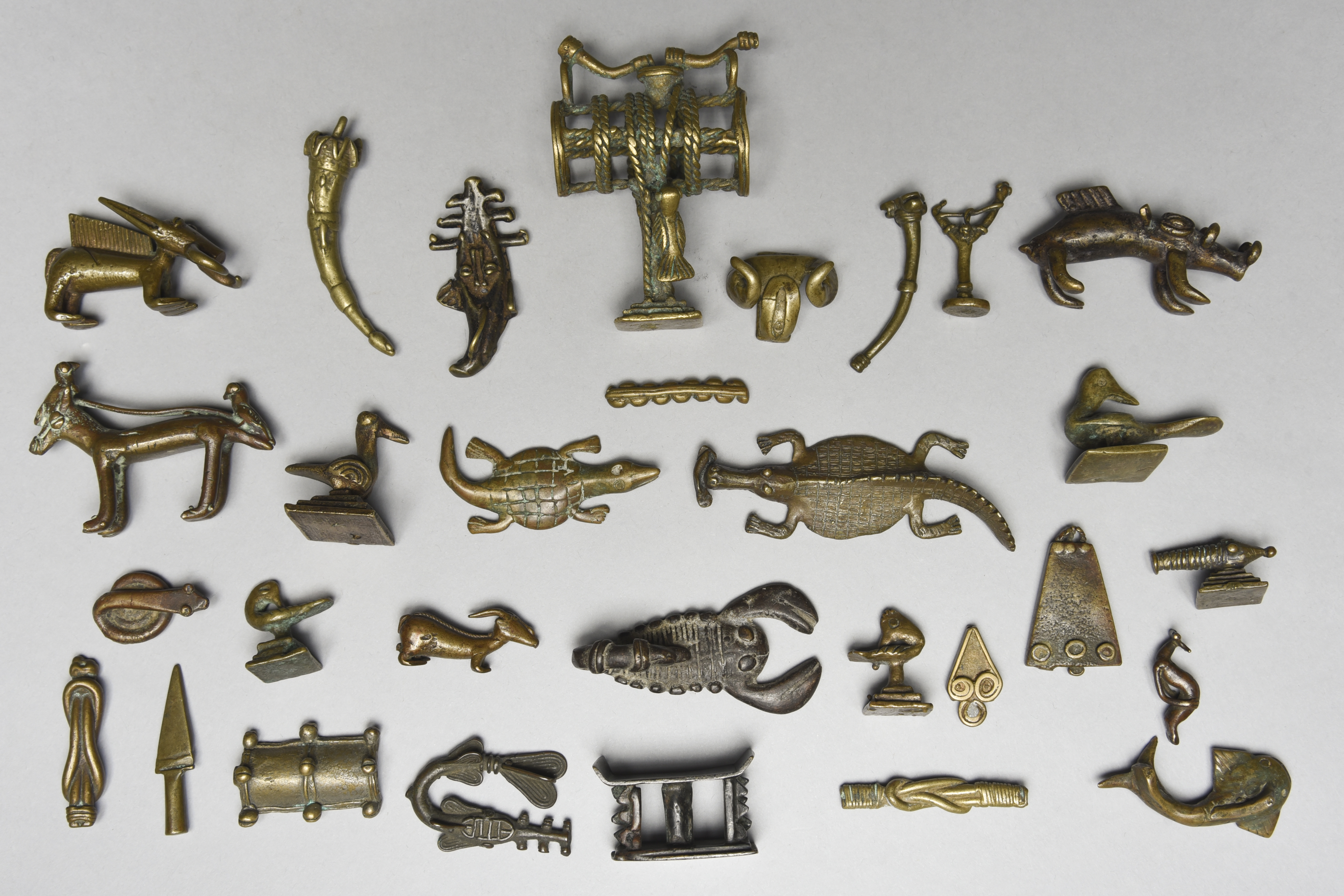 brass, including animals, birds, a cannon, a shield, a stool, two war trumpets, two knot charms and a mounted cylinder frame with a bird and two trumpets together with a Senufo brass figure. (30)