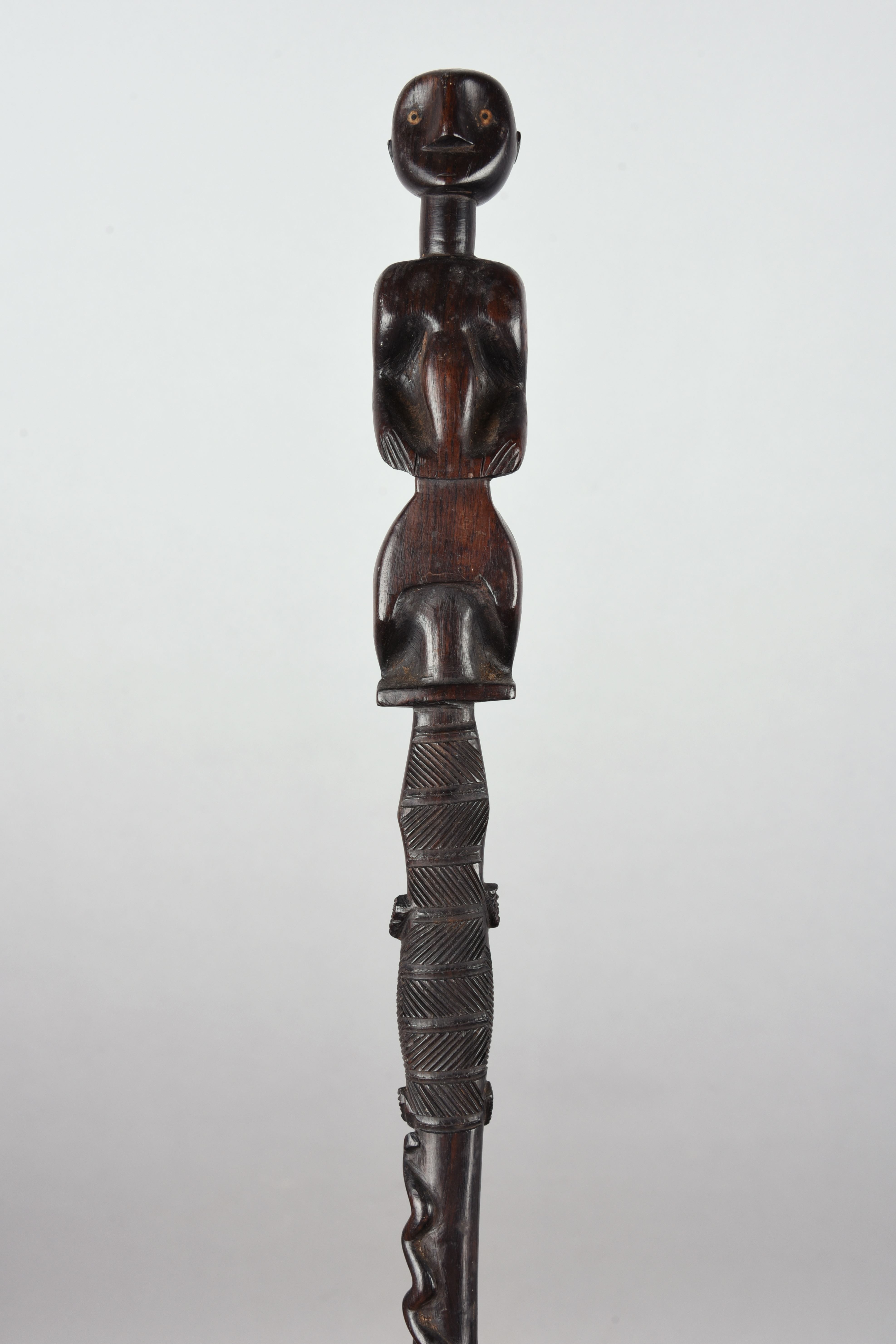 with a carved standing figure terminal with inset bone disc eyes, above a crocodile and two entwined snakes, with a brass tip,