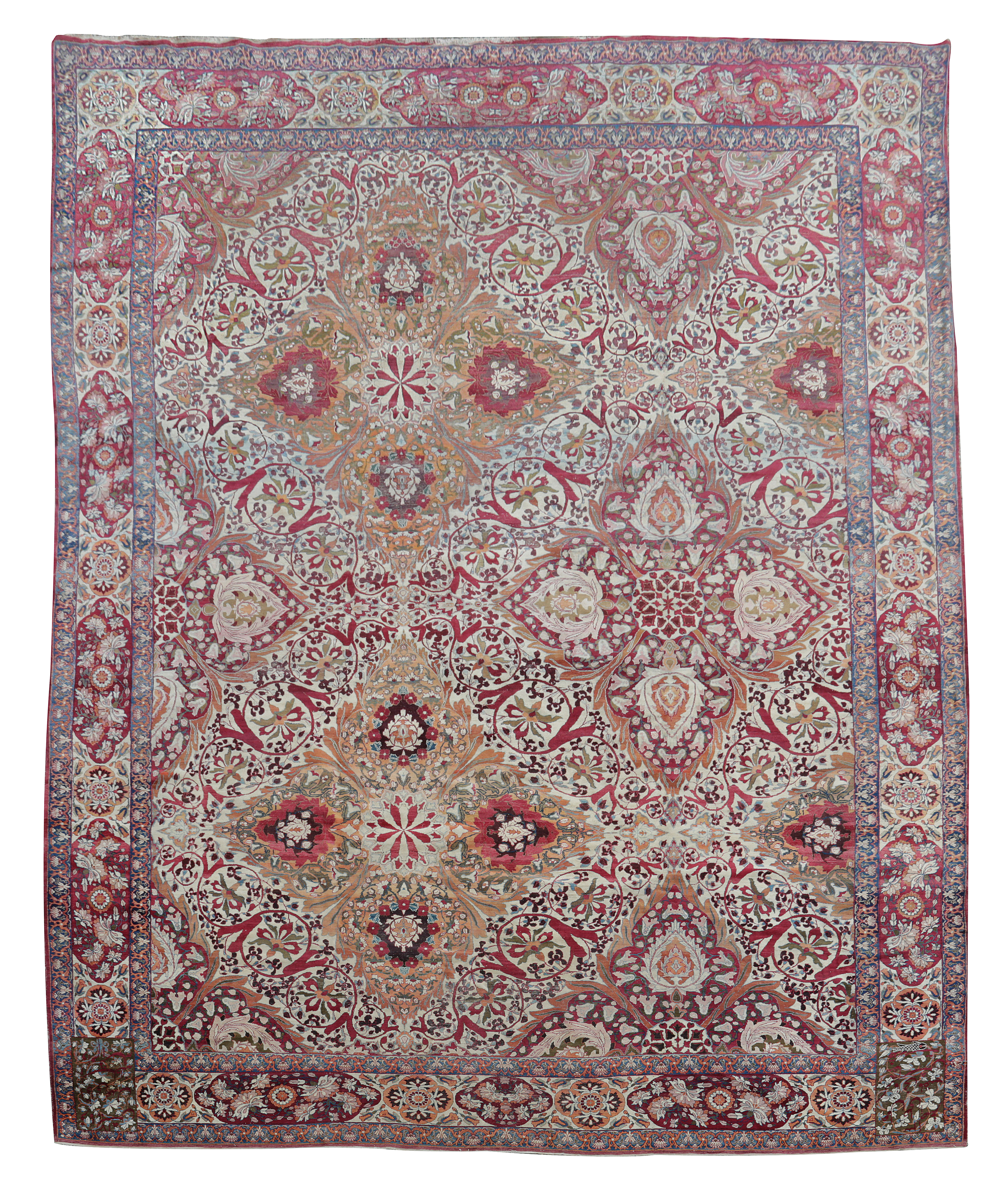 the ivory field with an asymmetrical design of large flowerheads and vines, enclosed by borders of cartouches flanked by sky blue meandering vine guard stripes, with two unusual inscribed panels in the upper border
