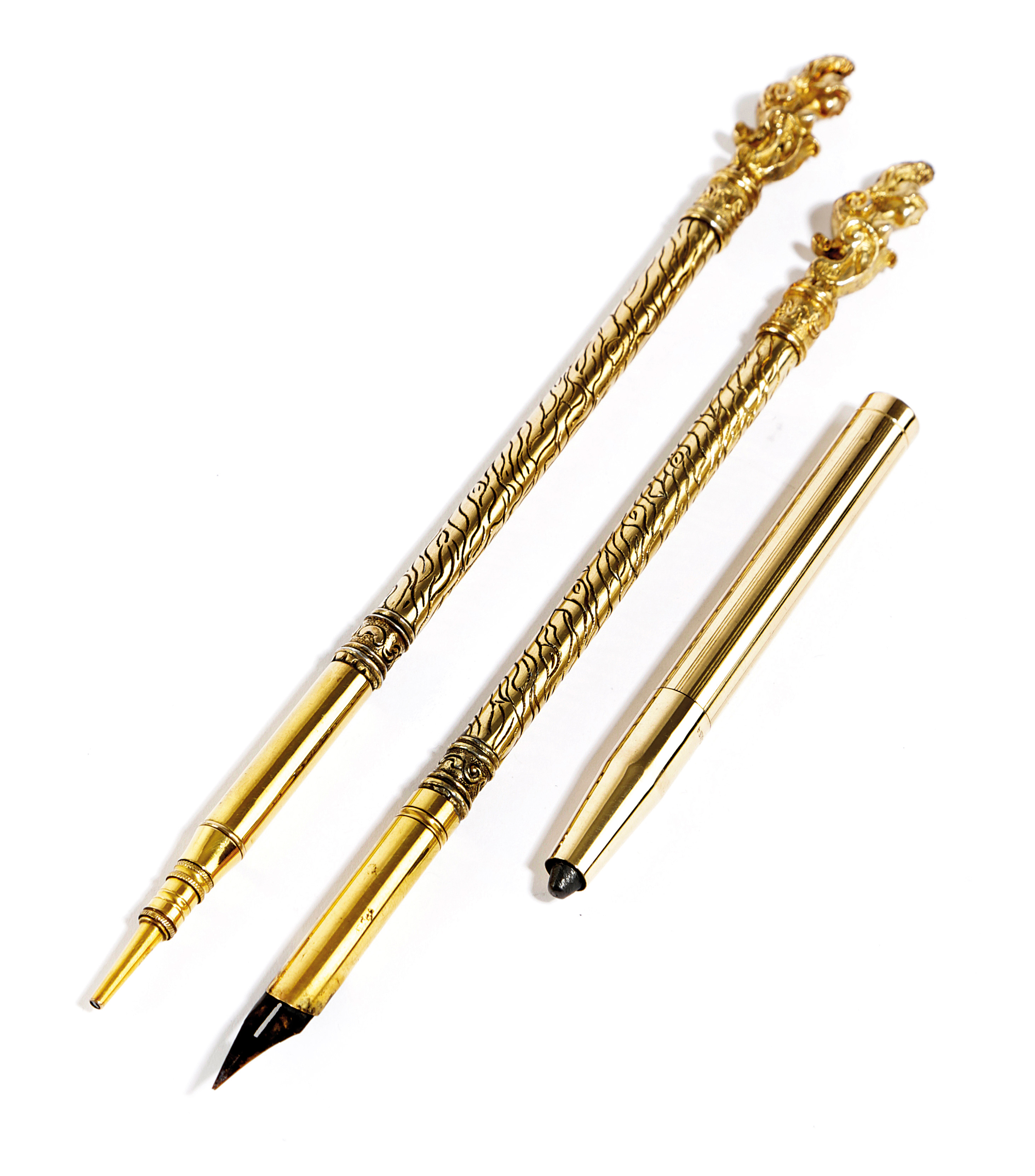 of cylindrical form, with reeded decoration, together with a gilt metal dip pen and pencil, of cylindrical form, the terminals with warrior head finials (3)