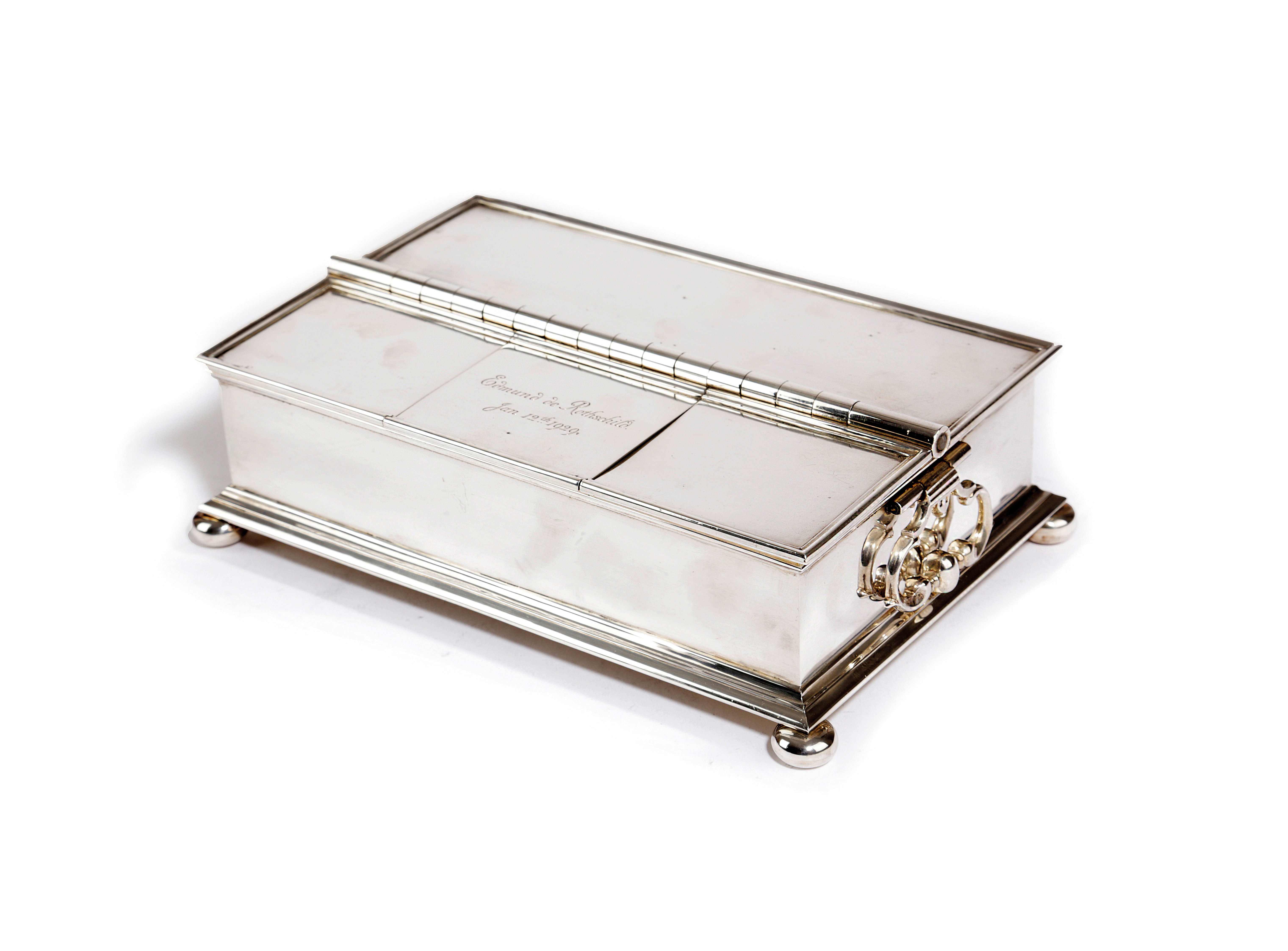 of rectangular form, with ring handles and four hinged covers, the interior with two silver-mounted glass inkwells, on four bun feet, the cover inscribed 'Edmund de Rothschild, Jan 12th 1929', the underside of the cover with a Hebrew inscription from 'Isaiah LXVI.22'