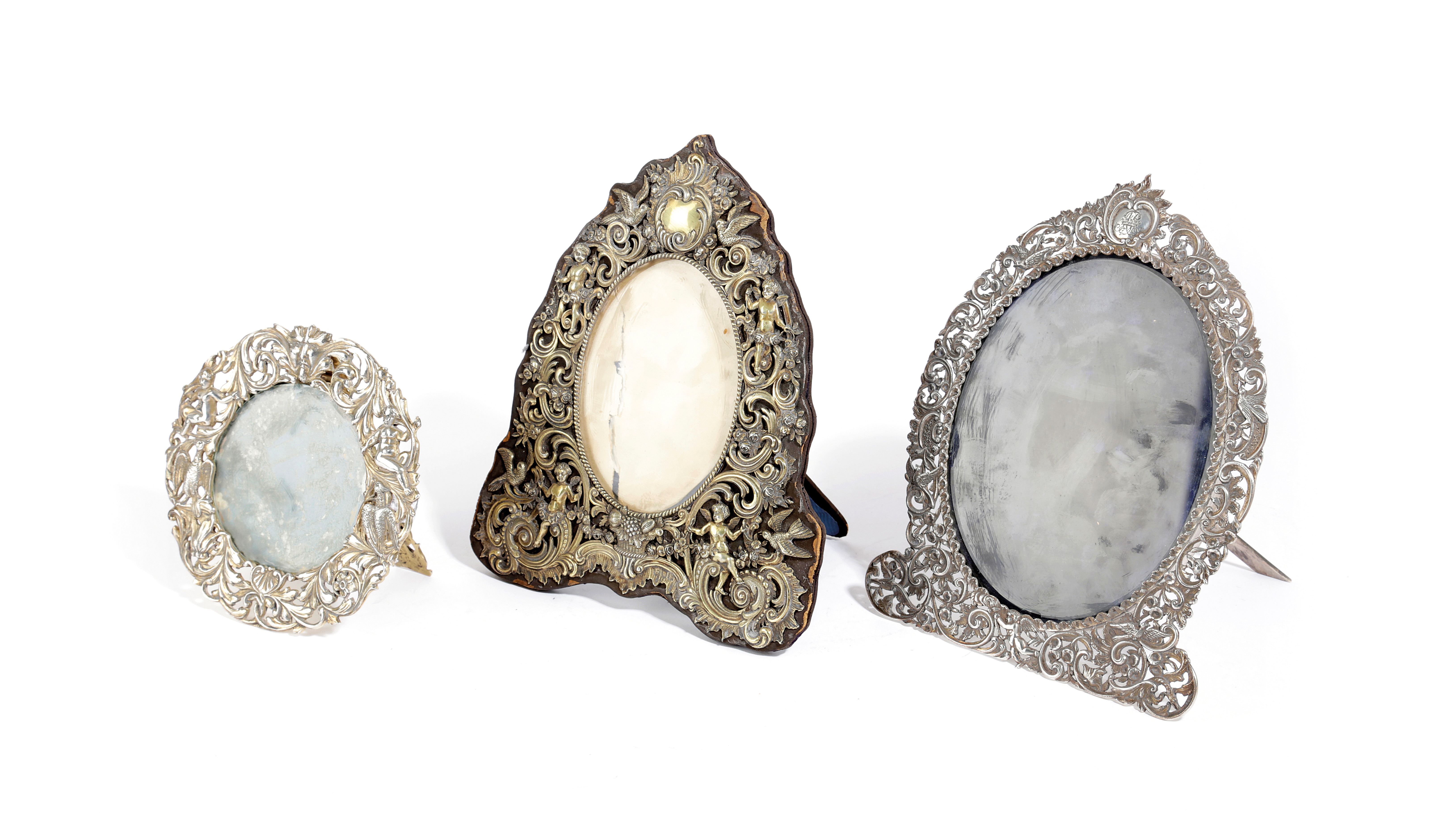 comprising: one by John Beresford, London 1887, of oval form, pierced and chased with birds, with a cherub and foliate scroll decoration, with the monogram of Alfred de Rothschild, with an electroplated easel back, 24cm high, together with a circular one by William Comyns, 1883, chased and pierced with a cherub and scroll decoration, with a pierced easel back, 15.5cm diameter, one by Harry Brasted, London 1901, of arched form, with cherubs, birds and foliate scroll decoration (3)