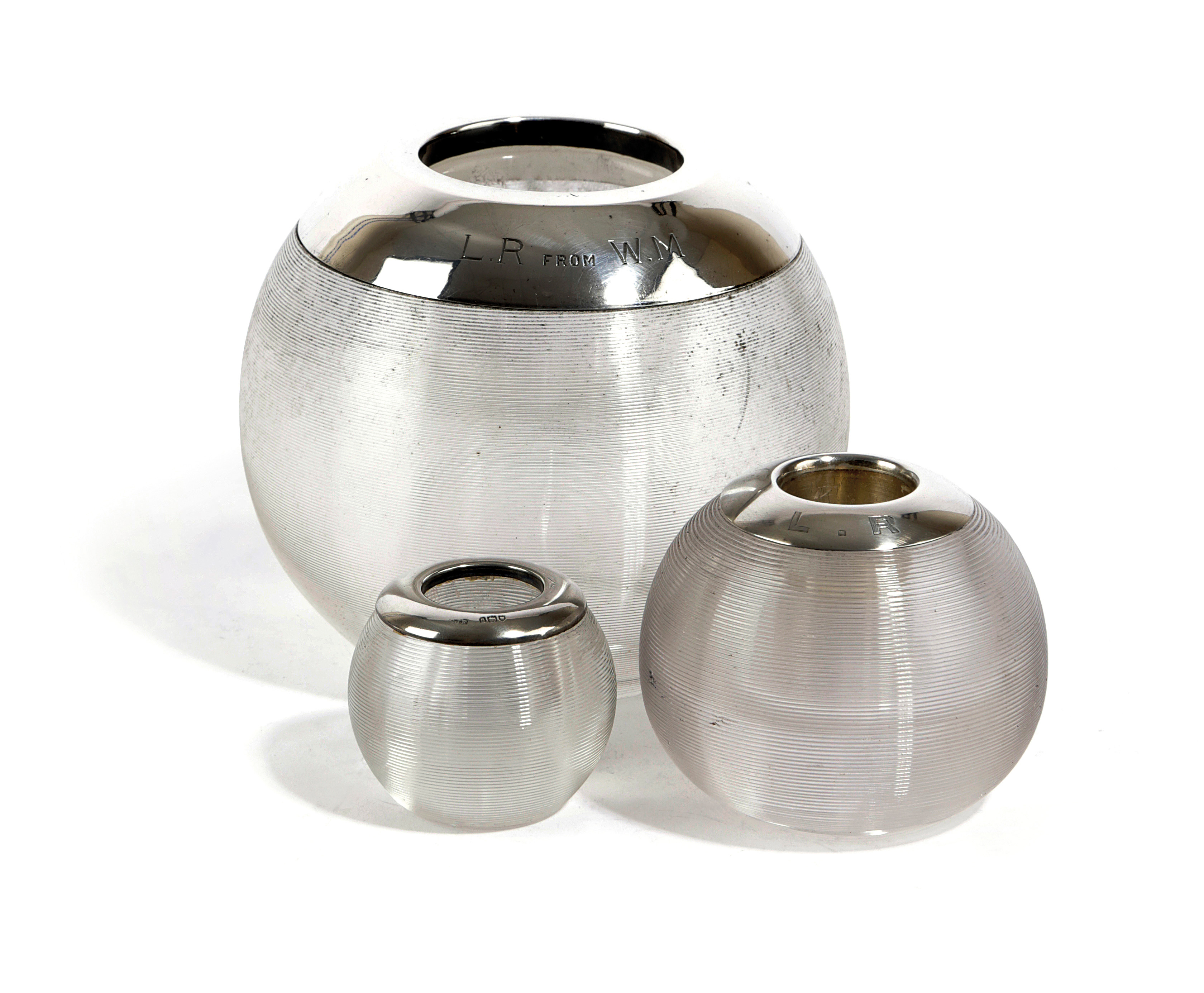 of globular form, the reeded glass body hollow to the underside, the plain rim inscribed 'L.R from W.M', 12.5cm high, with another silver-mounted table vesta striker, by J. Vickery, London 1903, initialled 'L.R'. and one other (3)