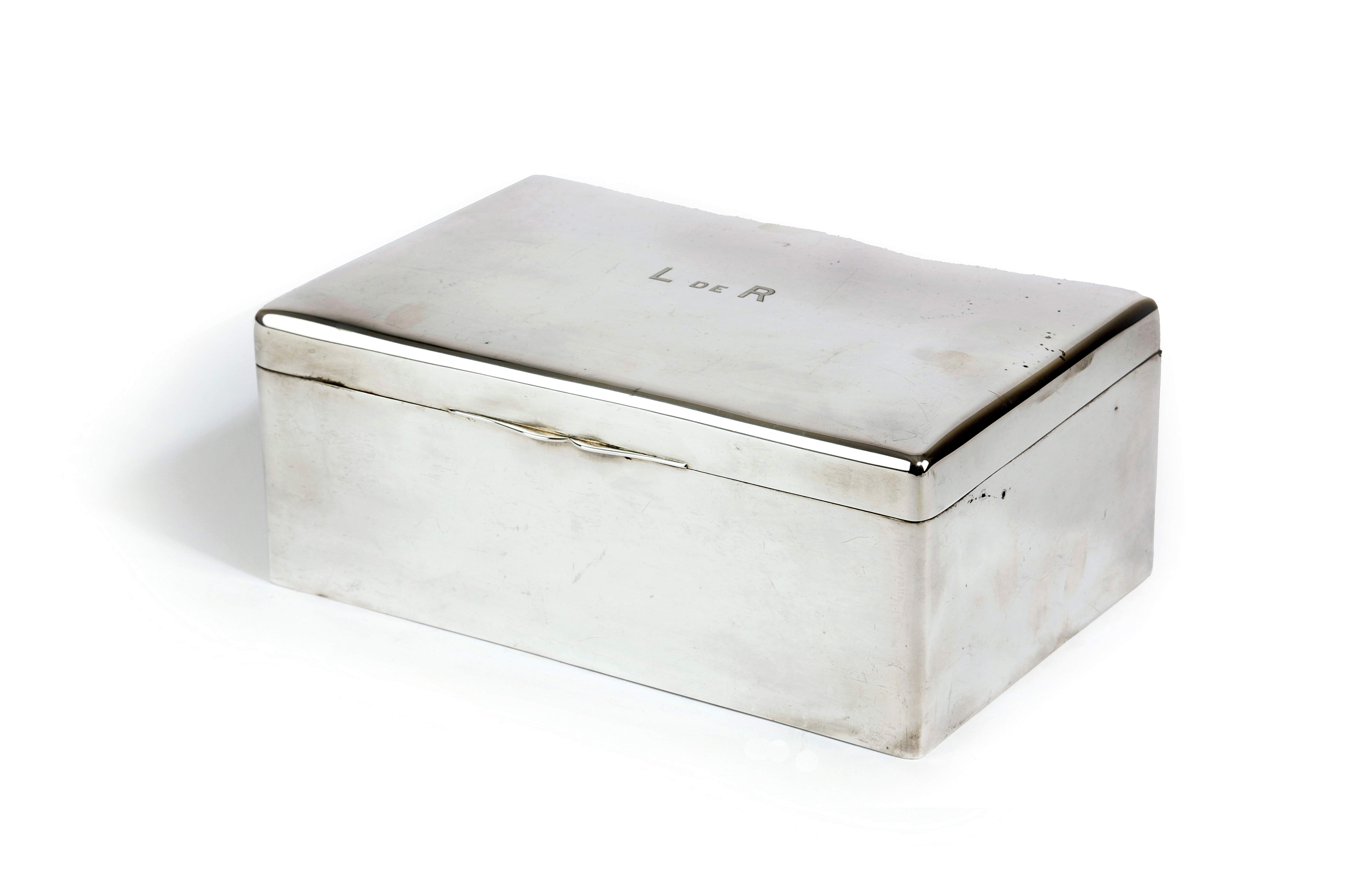 of plain rectangular form, the hinged cover engraved with the initials of Lionel de Rothschild, with a plain thumb-piece and wood lining