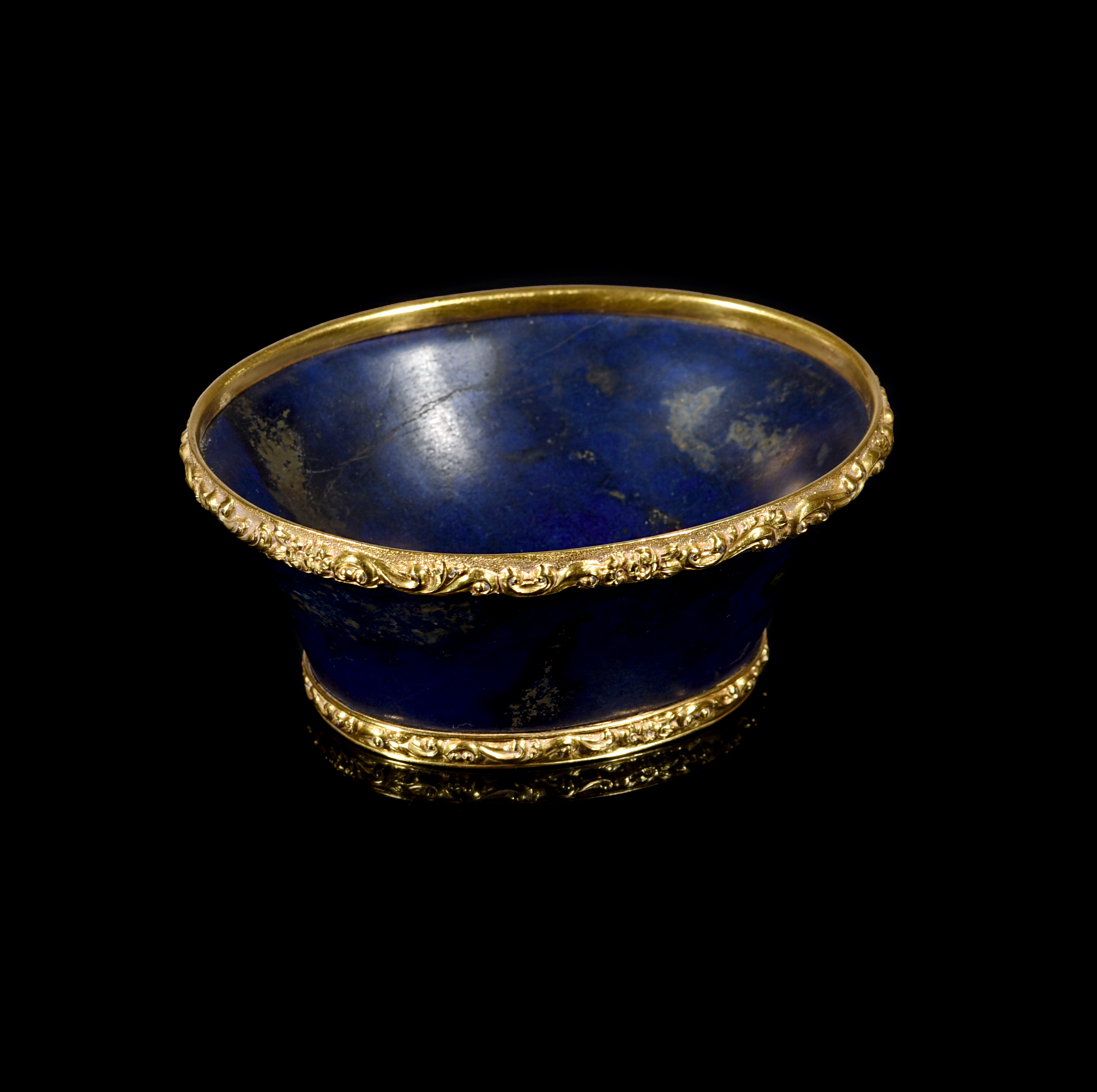 A LAPIS LAZULI AND GOLD MOUNTED OVAL BOWL