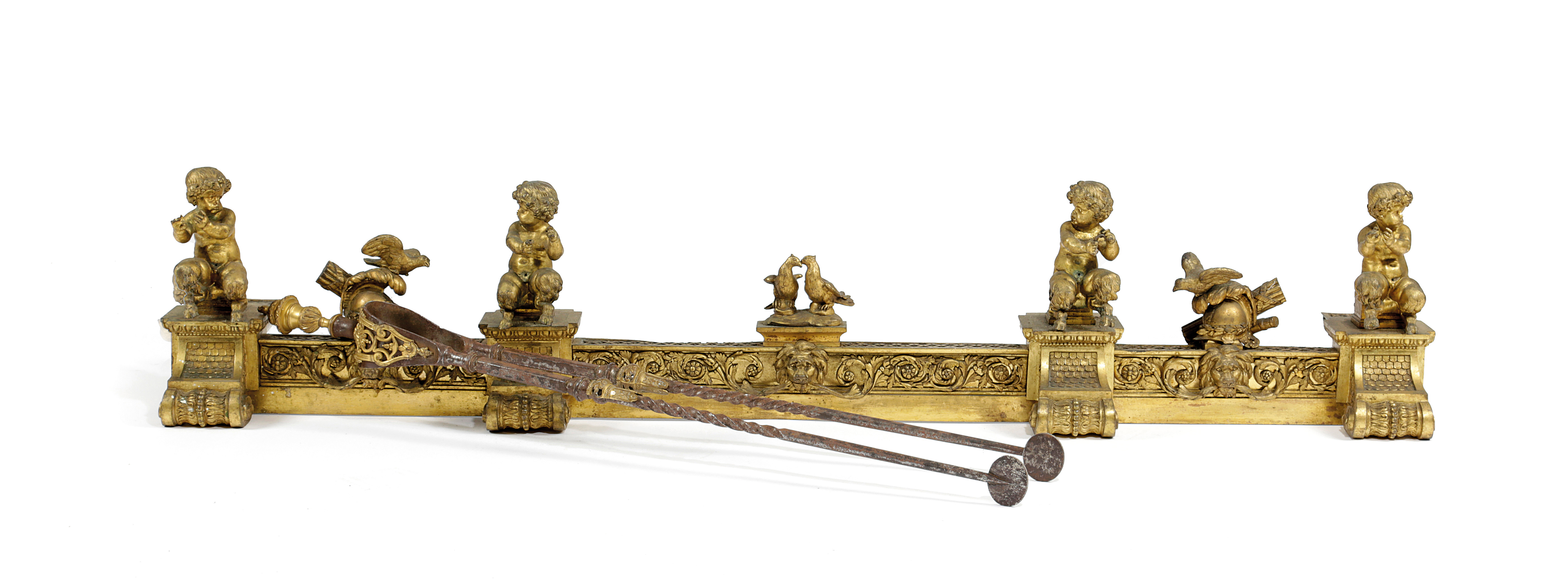 with cherubic faun figures playing music, interspersed with war trophies and doves of peace, with scrolling leaves and lion's masks, stamped '192', together with a pair of 18th century French steel and ormolu mounted fire tongs (2)