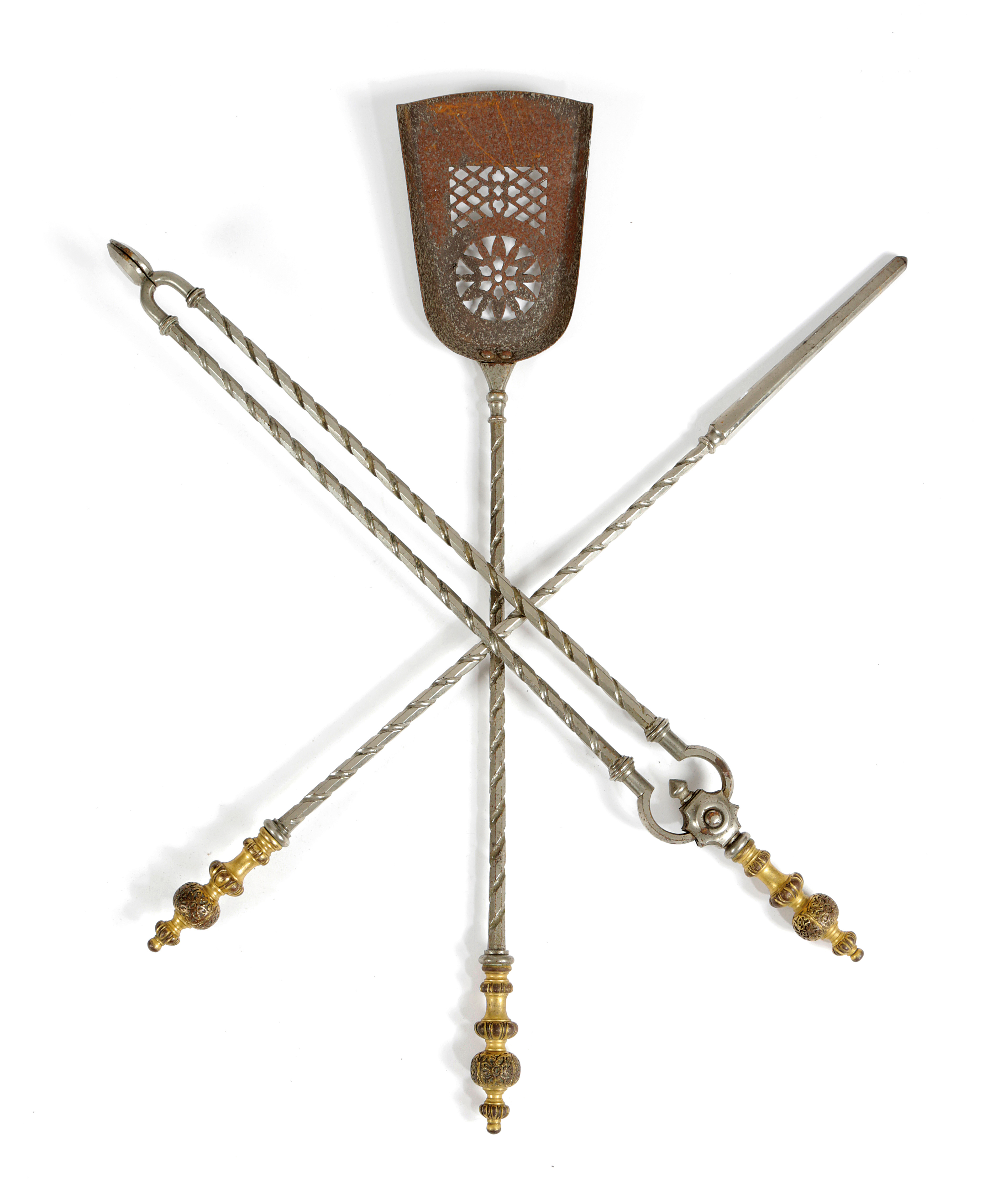 the shafts with spiral decoration, the handles with lobed and scrolling foliate knops, the spade with pierced rondel and trellis decoration (3)