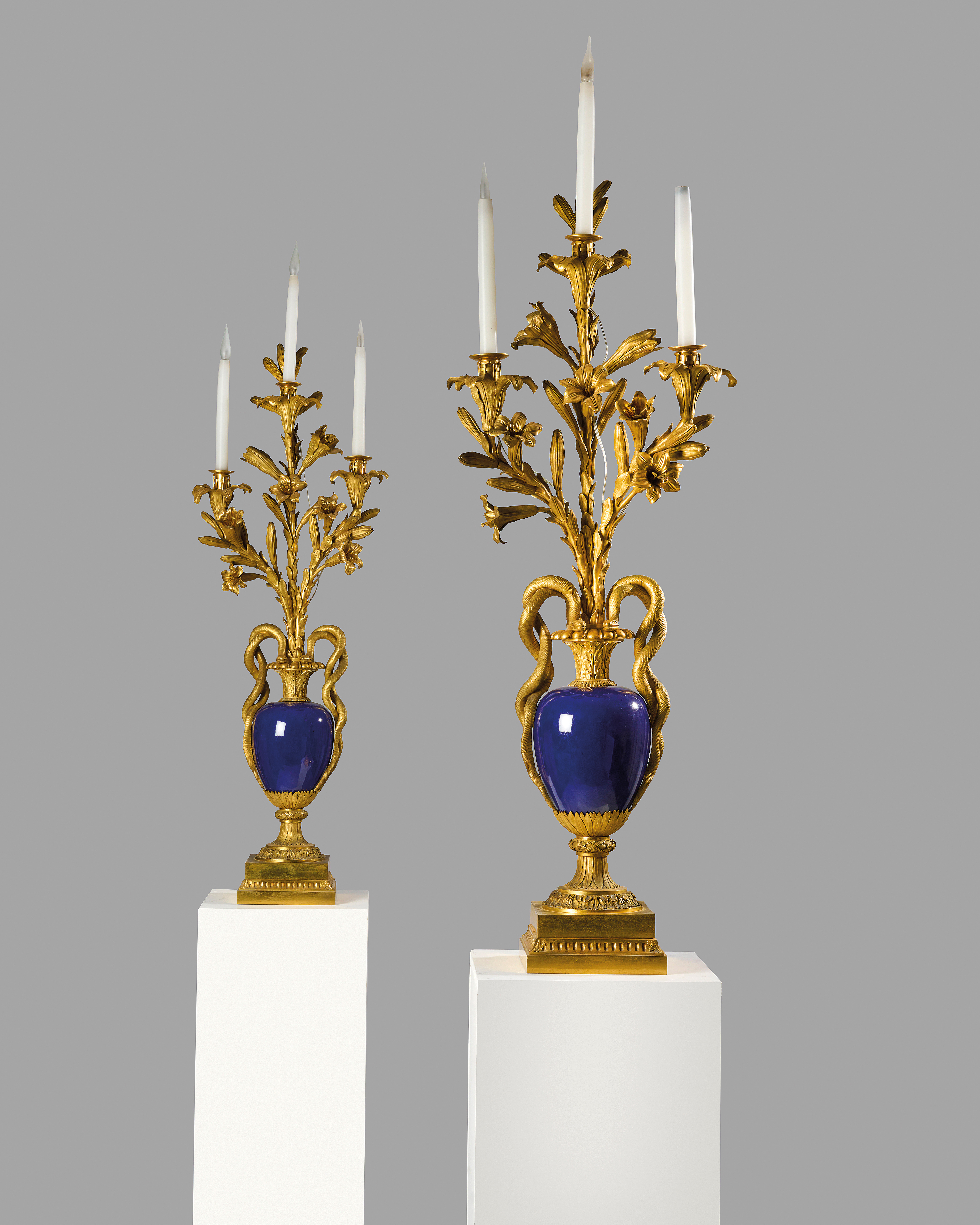 each with a royal blue ovoid body with entwined serpent handles, with stiff leaf decoration and a band of laurel to the spreading foot, later fitted with lily flower and leaf three-light candelabra branches, on a later fluted plinth, later drilled and fitted for electricity (2)
