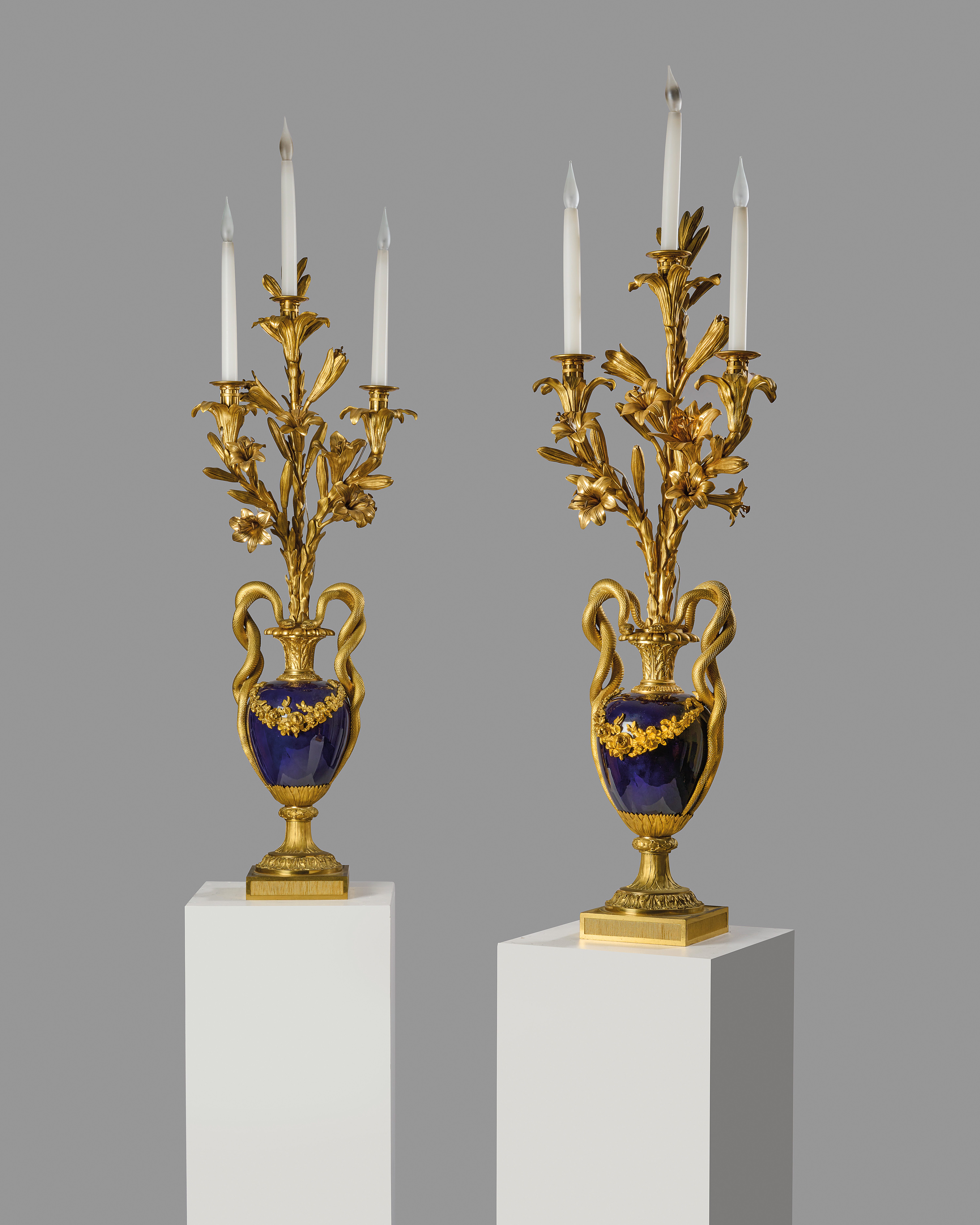 Rothschild Archive, London, Manuscript: 000/174/C/3, Christie, Manson & Woods Probate Valuation of 'The Estate of Alfred C. de Rothschild, Esq. C.V.O. Deceased, Halton House Tring', 1918. Listed as 'A pair of Louis XVI candelabra, formed of gros bleu Sevres porcelain vases, mounted with ormolu serpent handles and enriched with ormolu festoons of flowers, lily branches for three lights.'