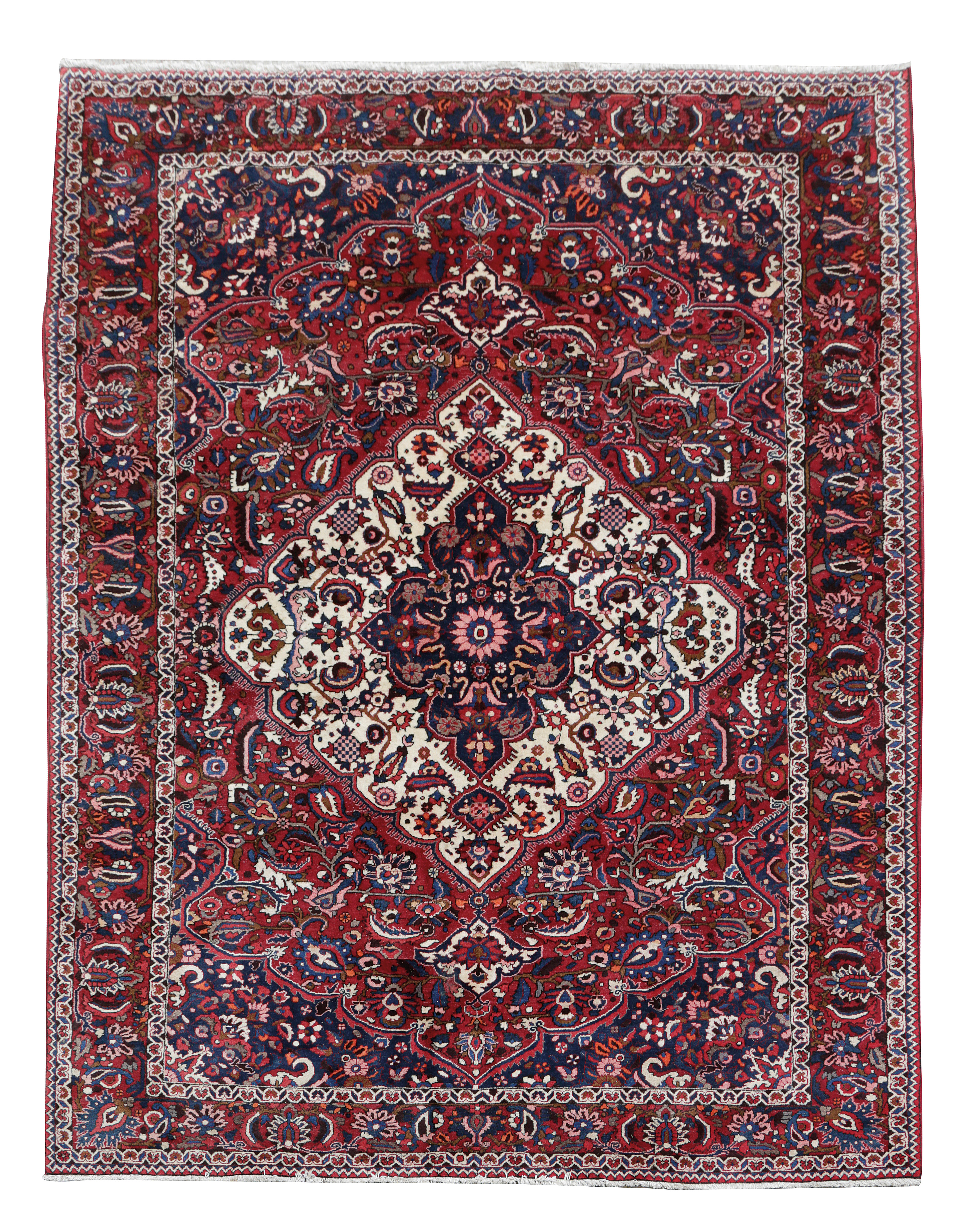 with a raspberry field of flowering vines around an ivory and indigo medallion framed by spandrels and meandering vine borders, flanked by carnation guard stripes; together with an Isparta carpet (2)