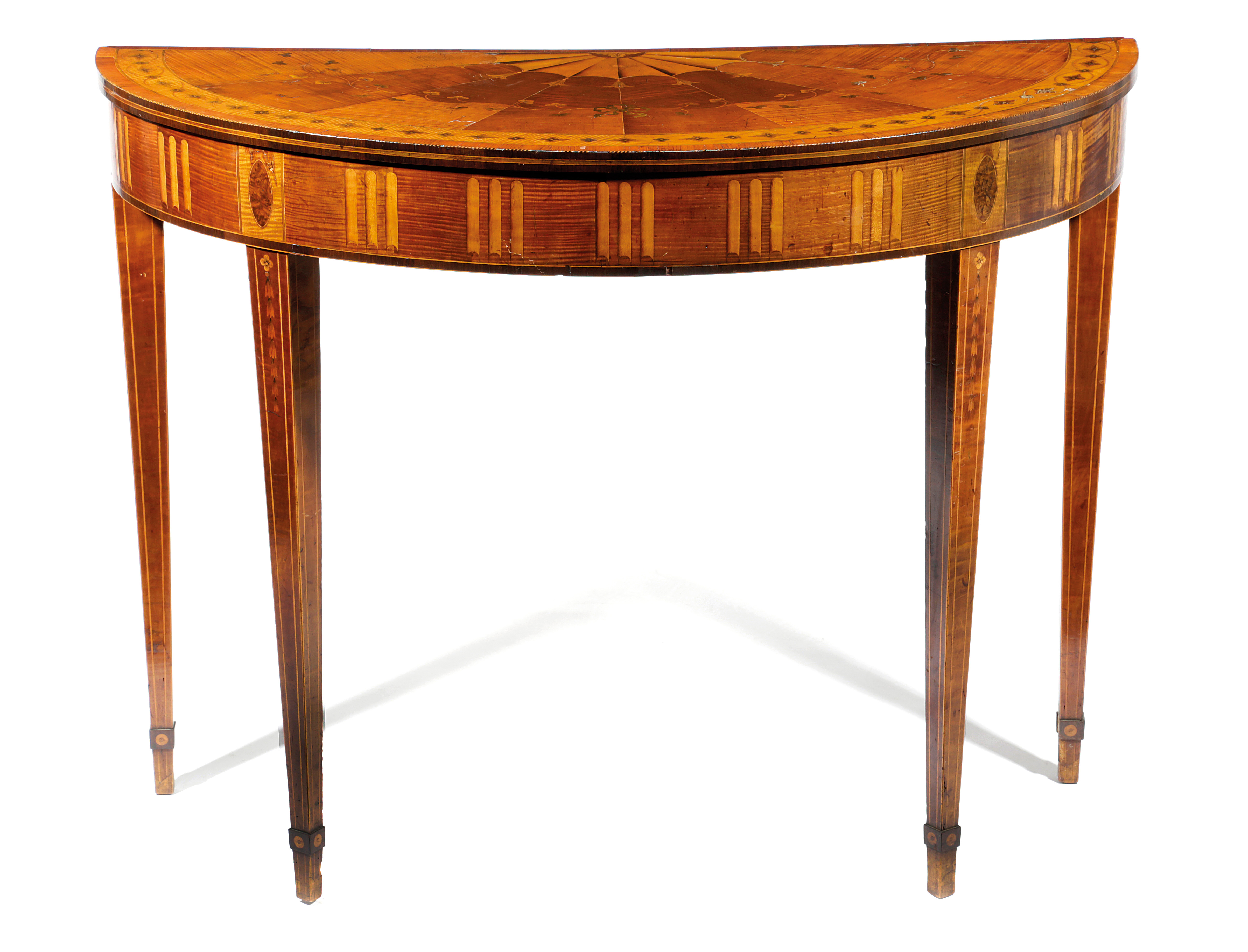 A GEORGE III HAREWOOD AND MARQUETRY DEMI-LUNE CONSOLE TABLE
