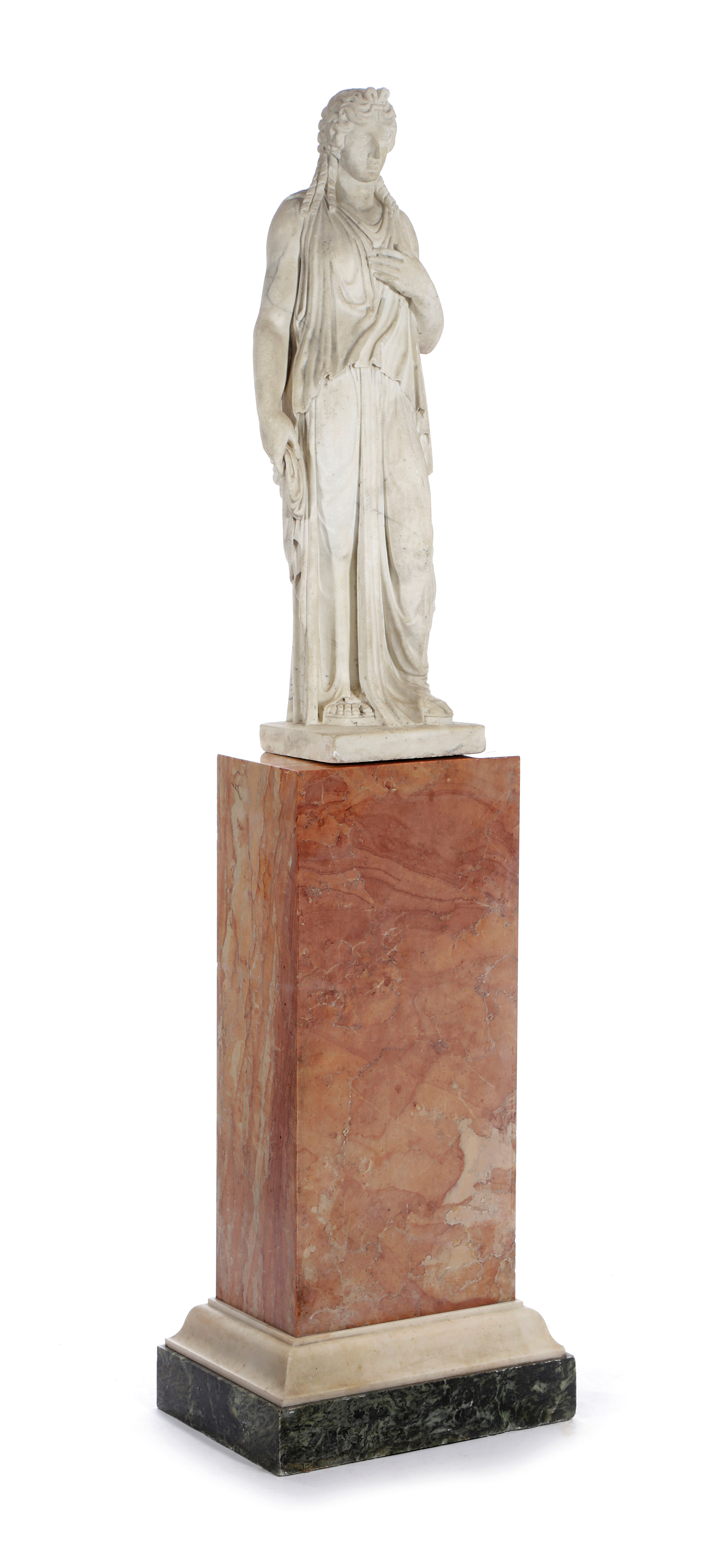 standing contraposto, wearing a diaphanous gown, with her left hand to her breast, on a rectangular base; together with a Sicilian jasper pedestal of rectangular section, with an ovolo moulding and a plinth foot (2)
