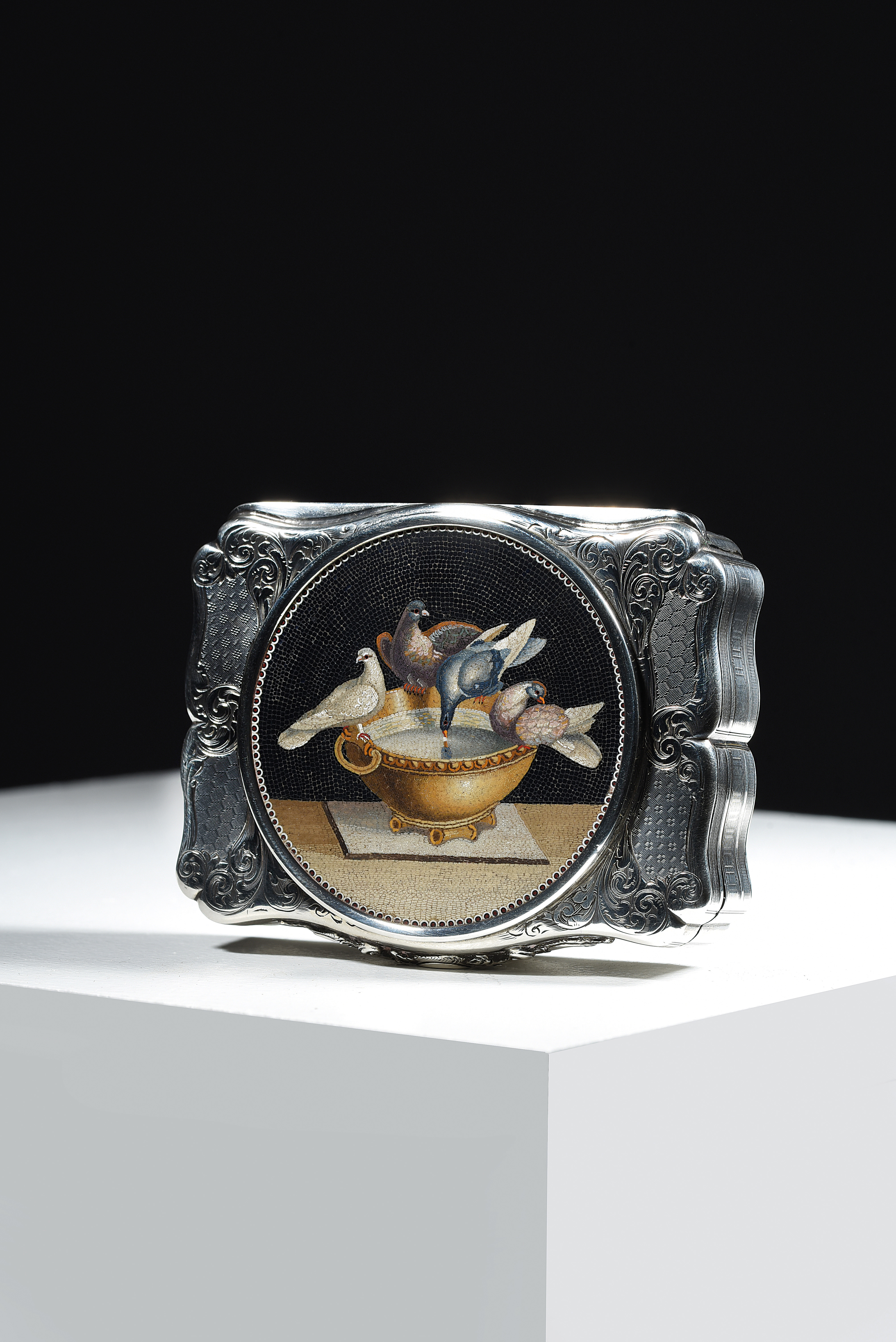 the silver box of serpentine outline with a Rococo thumbpiece and engraved with scrolls and panels of differing machined decoration, the hinged lid with a circular micromosaic panel depicting the Doves of Pliny, with a bead outer border, the base with an inscription 'To S. Mc Culloch Esqr from Elizabeth Brown', the gilt lined interior with Birmingham hallmarks for 1851 and makers mark for Edward Smith
