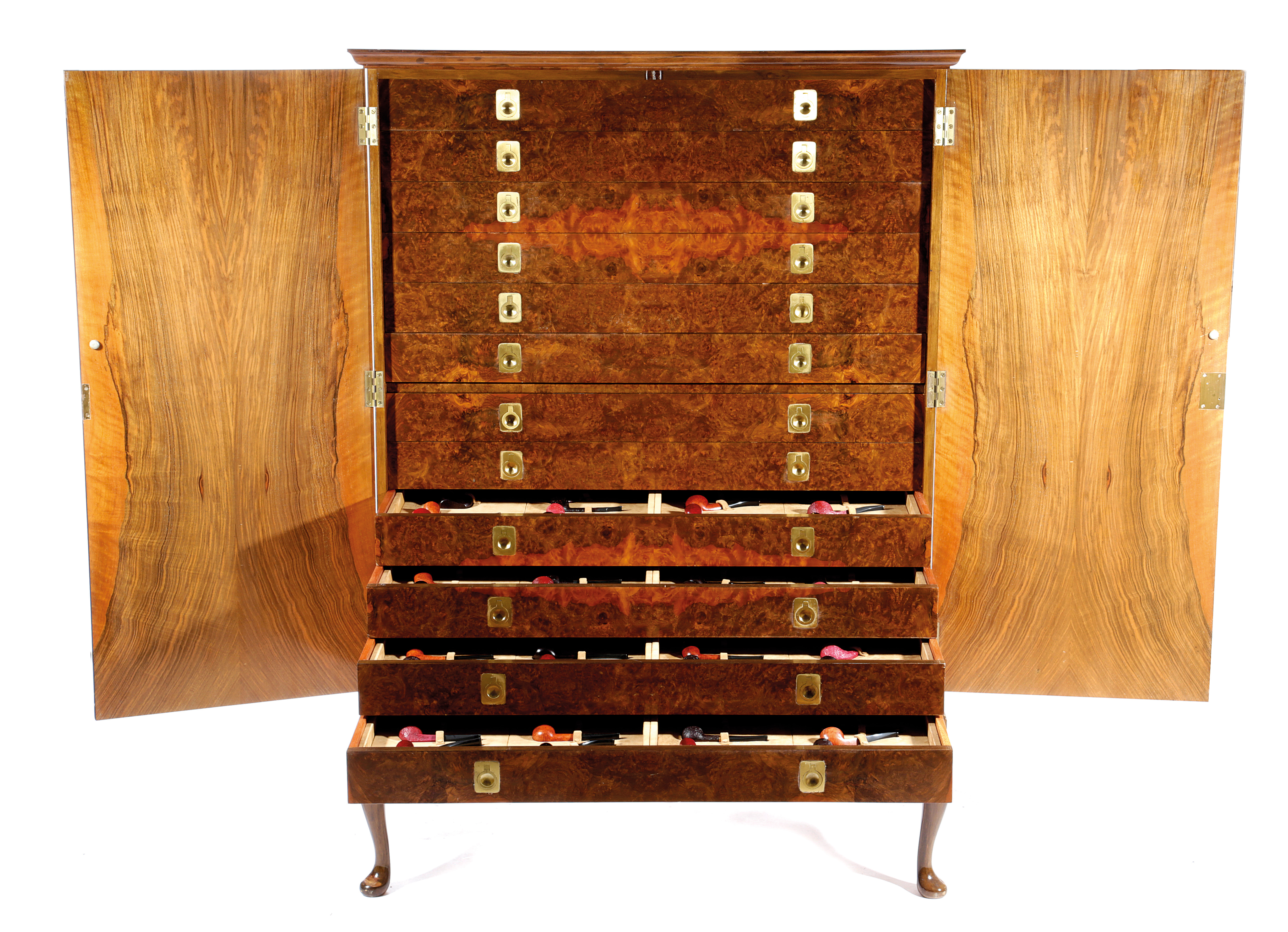 the Queen Anne style walnut cabinet with a moulded cornice above a pair of doors, holding twelve numbered drawers fitted to hold three-hundred and sixty-six Dunhill pipes, each stamped 'Dunhill' and with a shape number, the cabinet on cabriole legs
