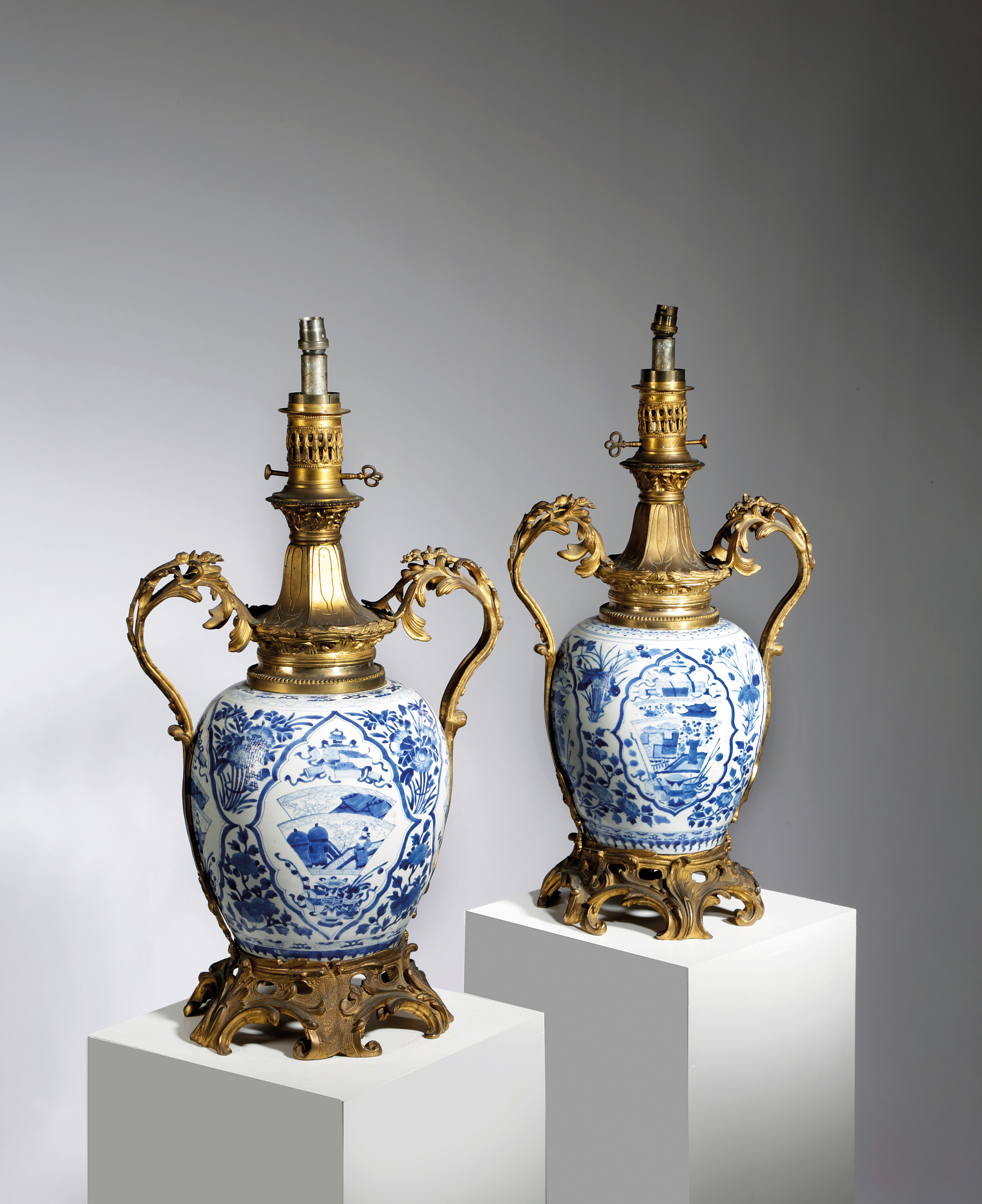 of ovoid shape, each decorated with cartouches of fan shaped panels and treasures, interspersed with floral sprays and flowering branches, beneath ruyi and flowerhead shoulders and floral feet, with scrolling foliate ormolu mounts and an oil lamp cover, now fitted for electricity (2)