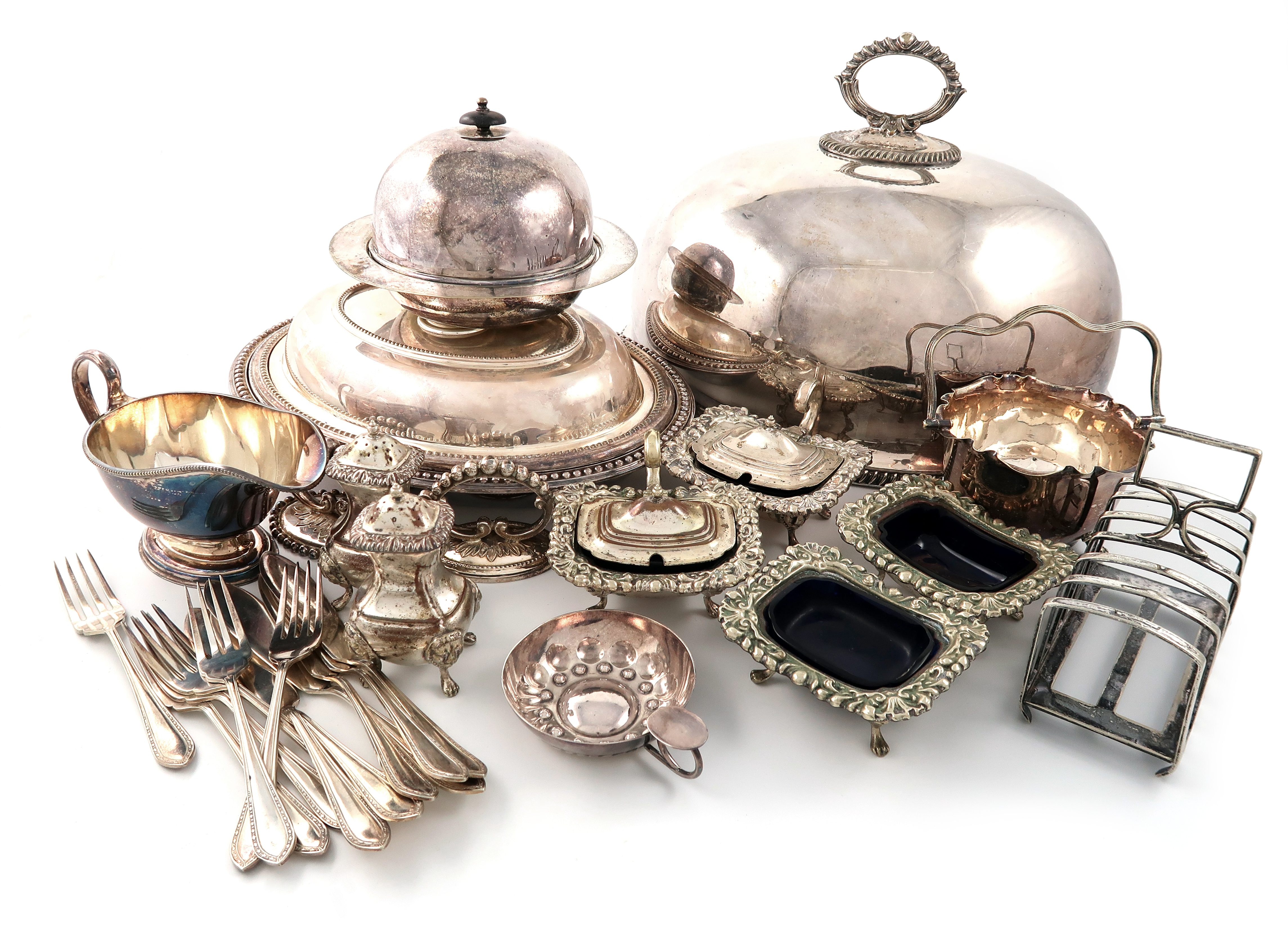 comprising: a set of three graduated meat dish covers, domed oval and circular form, beaded borders, engraved with a crest, plus a single meat dish cover, three entrée dishes and covers, a toast rack, an egg cruet frame and other items including a small quantity of flatware. (qty) (two boxes)