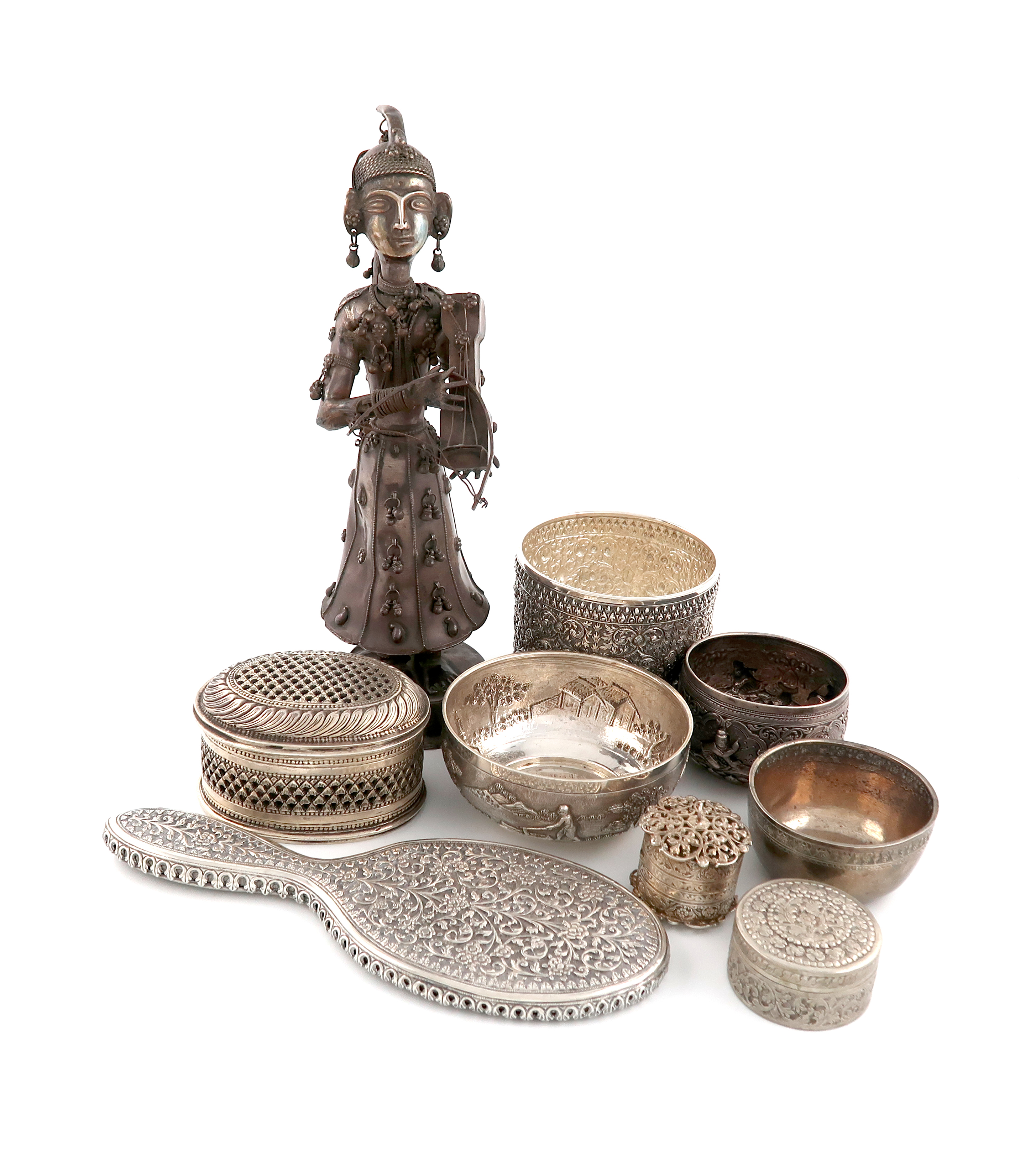 comprising: a standing female figure playing a musical instrument, plus a hand mirror, four bowls, four cased spoons, an oval box with a pierced cover, a circular box, and a pierced cylindrical box with a pierced cover and base, approx. total weighable 1270g.