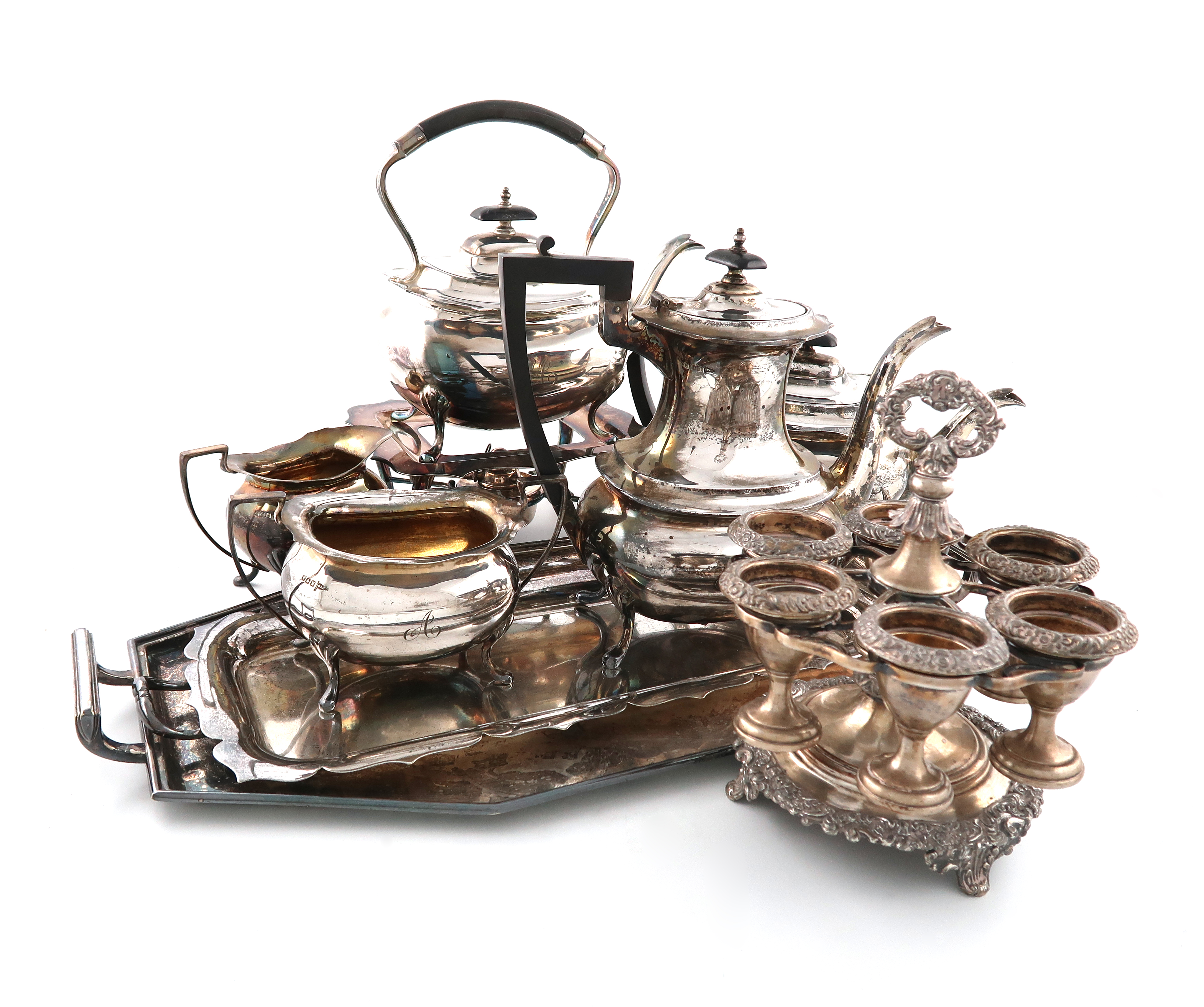 comprising: a five-piece tea and coffee set by Walker and Hall, oblong bellied form, initialled, plus two trays and an old Sheffield plated six egg-cup cruet frame, with six egg cups, (one a.f). (8)