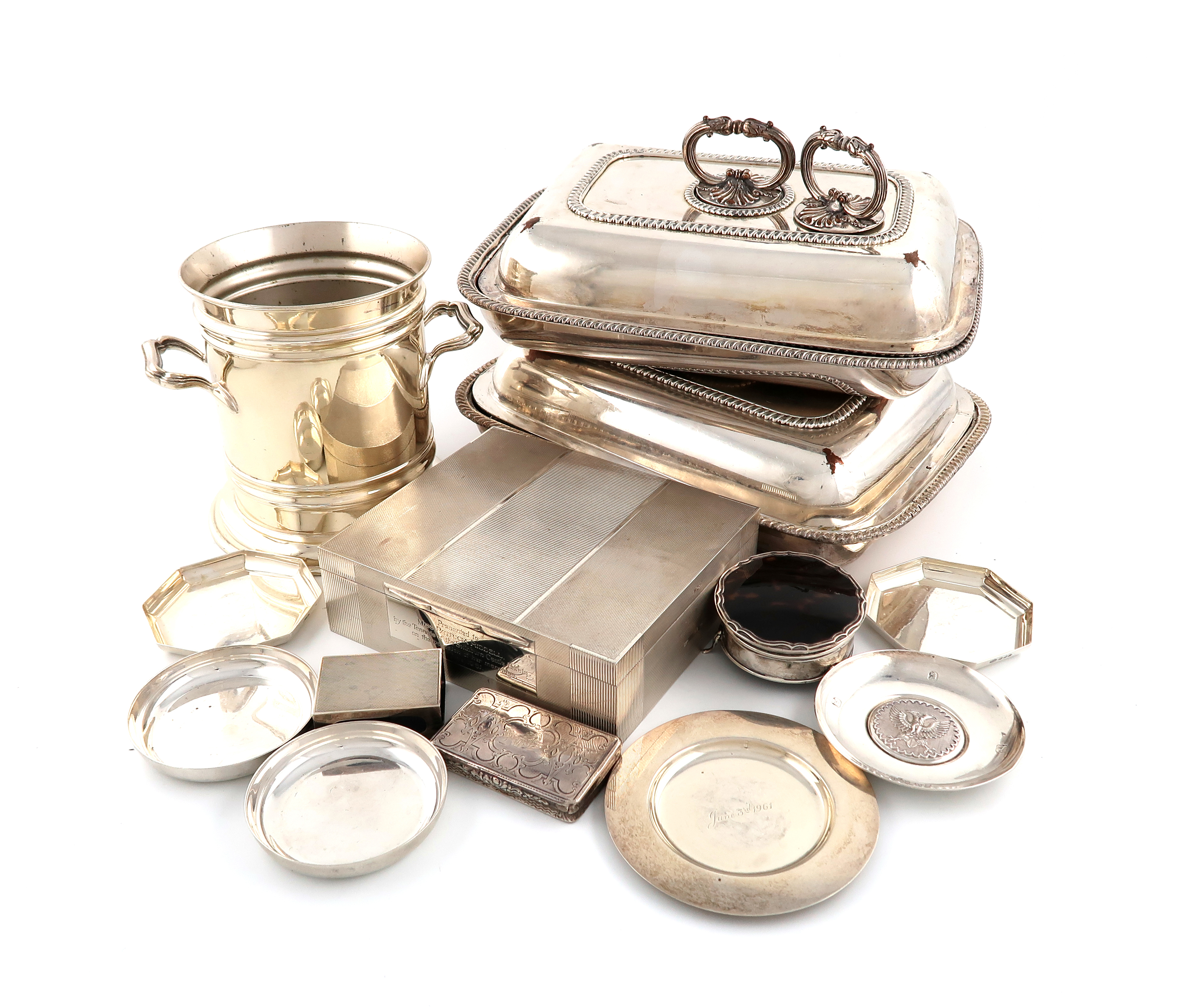 comprising silver items: a cigarette box, Birmingham 1950, inscribed, plus two pairs of ashtrays, a matchbox cover, two further dishes, a French snuff box, a silver-mounted tortoiseshell dressing table box, and an electroplated siphon stand, plus a pair of old Sheffield plated entree dishes and covers, approx. weight 16.9oz. (qty)