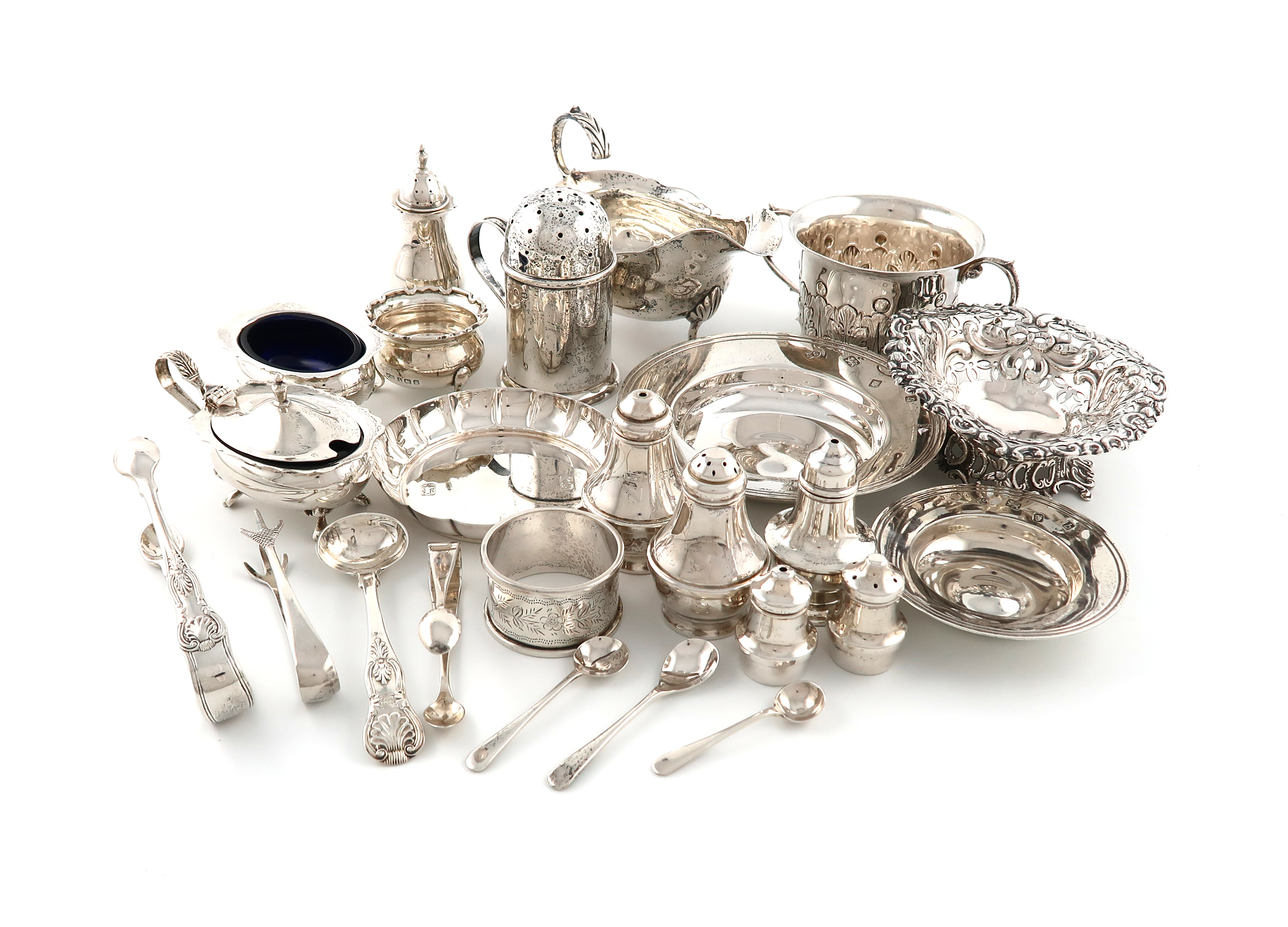 comprising: a George III cream boat, London 1765, oval form, a two-handled porringer, a pierced heart-shape bonbon dish, two Armada dishes, a kitchen pepper pot, Birmingham 1893, a circular dish, a three-piece condiment set, six further condiments, three pairs of sugar tongs, and four condiment spoons, approx. weighable 29.3oz. (24)