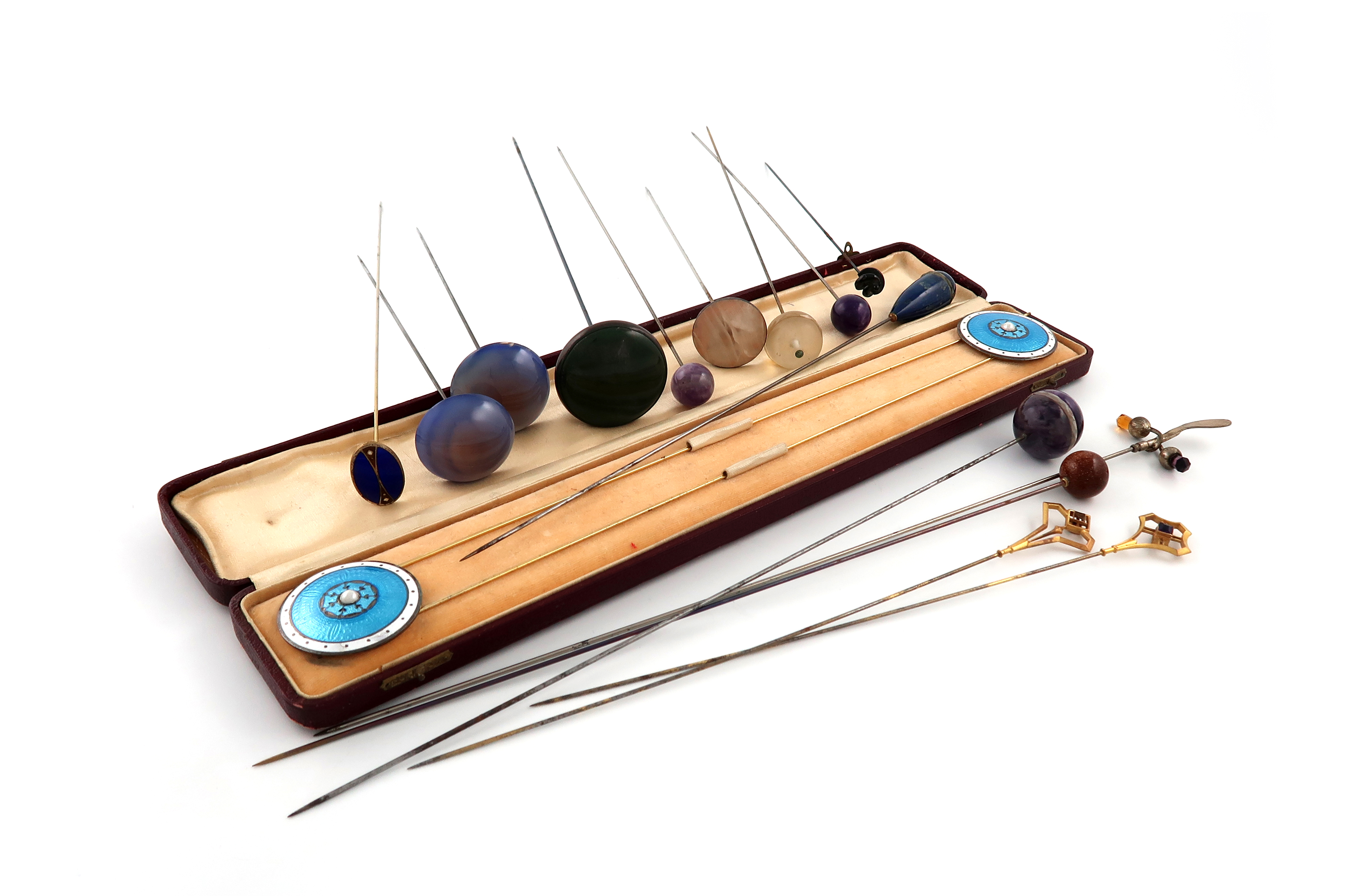 comprising: an enamel pair, circular form, with blue enamel decoration, white borders, gilt backing, in a fitted case, a 9 carat hat pin, pierced decoration, set with a purple cabouchon, plus another similar, unmarked, and various others. (qty)