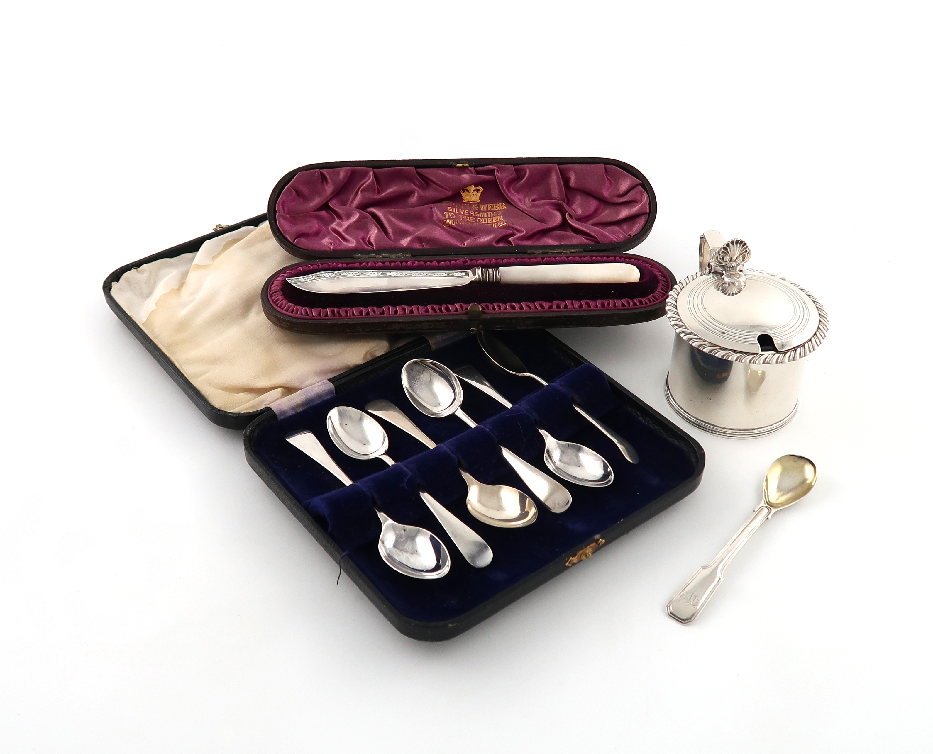 comprising: a George IV mustard pot, by Messrs. Lias, London 1829, circular form, gadroon border, scroll handle, with a blue glass liner, plus a condiment spoon, cased butter knife, and a set of six cased teaspoons, approx. weighable 2.7oz. (4)