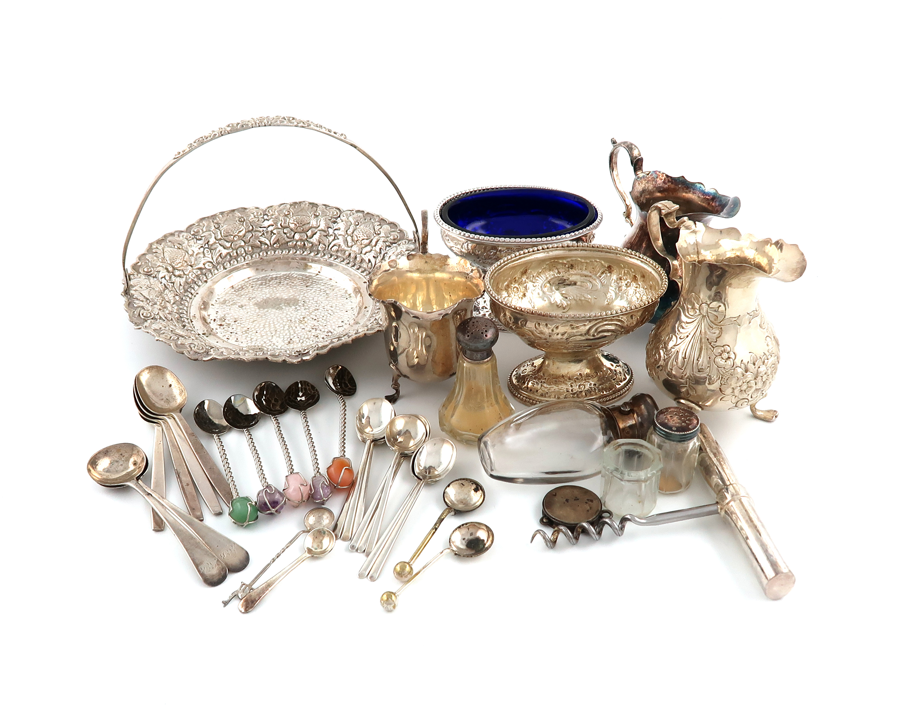 comprising: three cream jugs, a pair of oval salt cellars, one blue glass liner, a Victorian silver-gilt mounted clear glass scent bottle, London 1865, a pepper pot, a modern corkscrew, a miniature tambourine, various spoons and a metalware dish, approx. weighable 17oz. (qty)