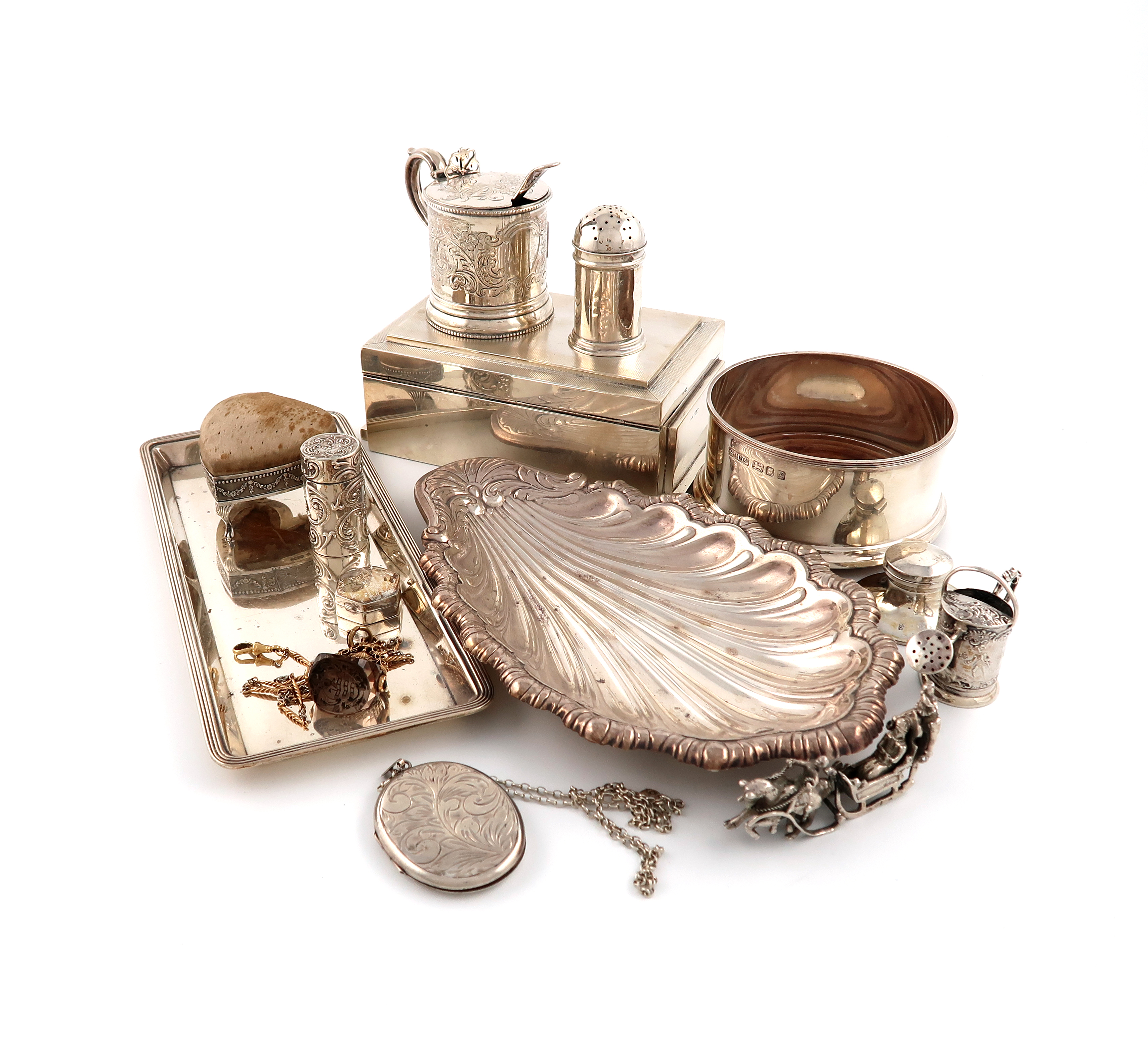 comprising: a Victorian mustard pot, by Joseph Angell, London 1856, a modern coaster, a shell dish, a pen tray, a cigarette box, a miniature watering can, a kitchen pepper, a cotton holder, an inkwell, miniature sledge, a locket, a box, a heart-shaped pin cushion, a pill box and a gold-mounted revolving smoky quartz fob seal, with three faces, engraved with an armorial and crest, with a chain, approx. weighable 23oz, weight of chain 10g. (qty)