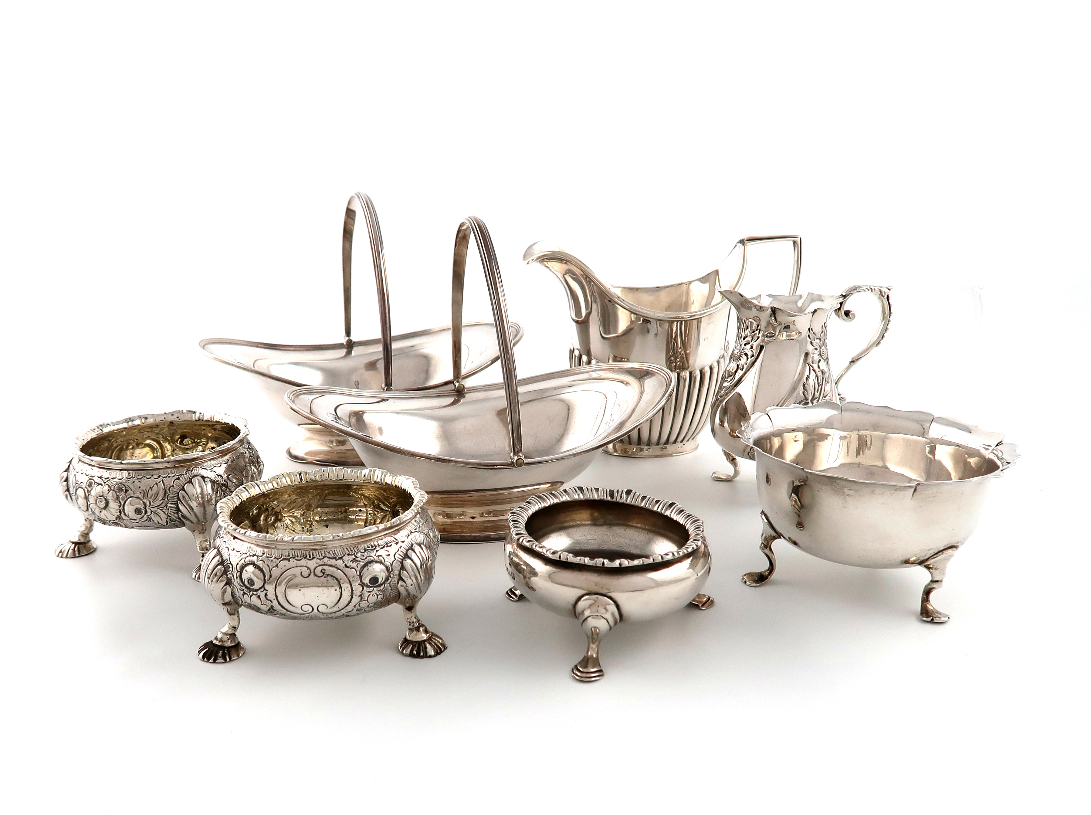 comprising: a matched pair of George II salt cellars, London 1754 and 1757, circular form, embossed with foliate decoration, a further salt cellar, lacking liners, a pair of swing-handled sugar baskets, by Atkin Brothers, Sheffield 1901, oval form, reeded border, a baluster cream jug, another cream jug, and a sugar bowl, approx. weight 29oz. (8)