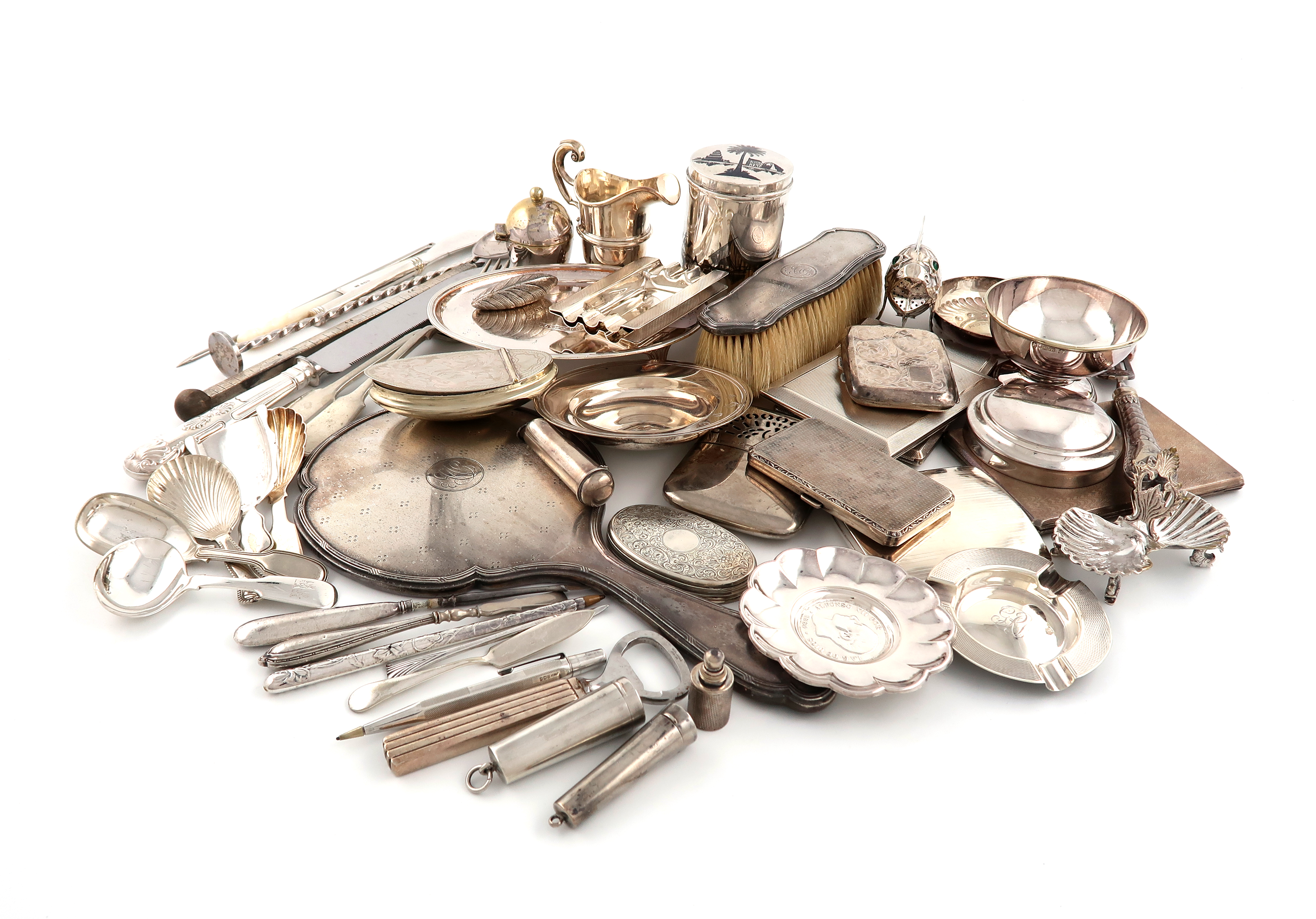 comprising silver items: six cigarette cases, an armada dish, three ashtrays, a cream jug, a hand mirror, an Iraqi pot, a brush. a continental shell salt, a Jensen bottle opener, a pencil, two cigar holder cases, a novelty metalware fish peeper pot, plus other items and electroplated items: a teapot stand, a tobacco box, a ruler and other items, approx. weighable 39oz. (qty)