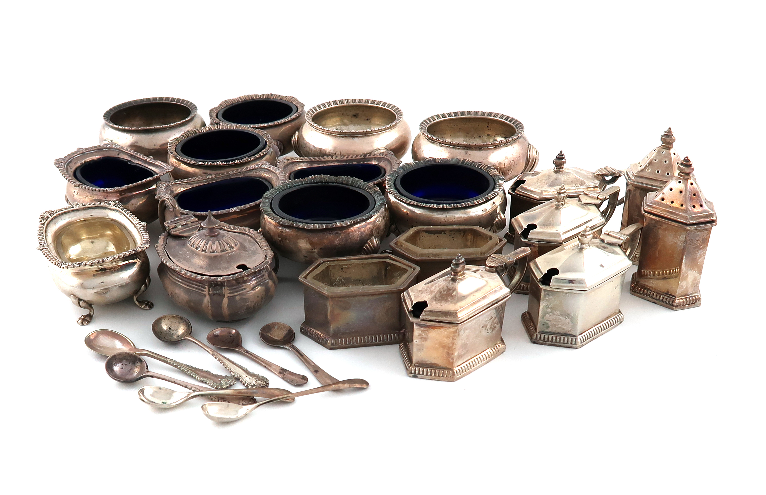comprising: a set of four salt cellars, London 1898, by George Lambert, a set of three salt cellars, London 1872, a mustard pot, four matched salt cellars, an matched eight-piece condiment set, by the Goldsmiths and Silversmiths Company, London 1921 and the Adie Brothers, Birmingham 1951, some crested, plus four silver condiment spoons and three electroplated condiment spoons, approx. weight 34oz. (qty)