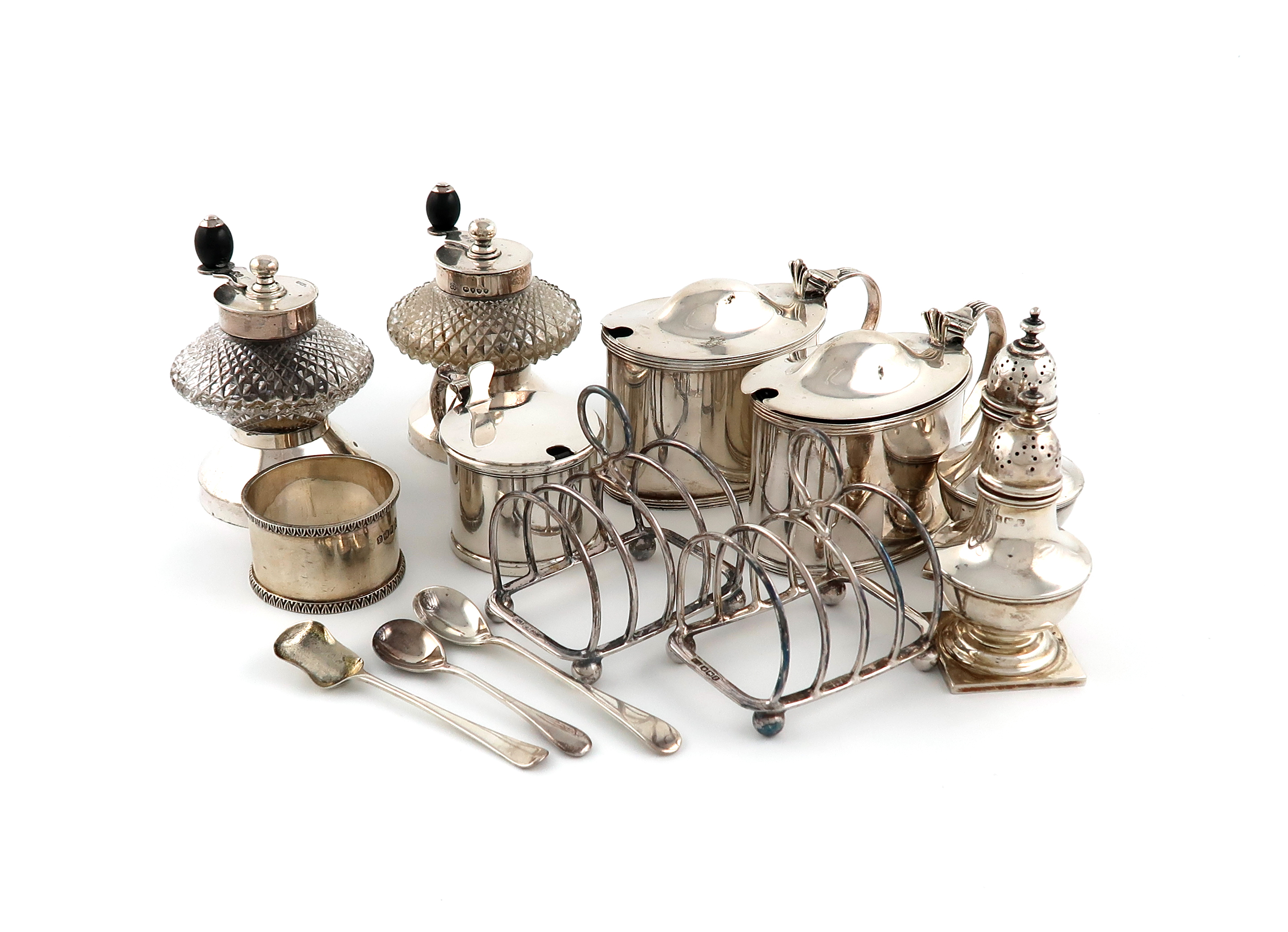 comprising: a matched pair of late Victorian pepper mills, by Hukin & Heath, London 1894 and Birmingham 1887, baluster form, with hob-nail glass bodies, on a plain, raised circular foot, height 8.7cm, a pair of small, five-bar toast racks, a pair of mustard pots, by Nathan & Hayes, Birmingham 1915, plain oval form, reeded scroll handles, blue glass liners, a small mustard pot, plain circular drum form, a pair of pepper pots, by Edward Barnard & Sons Ltd, Birmingham 1921, baluster form on square bases, a napkin ring, plus three various condiment spoons, approx. weight 17oz. (13)
