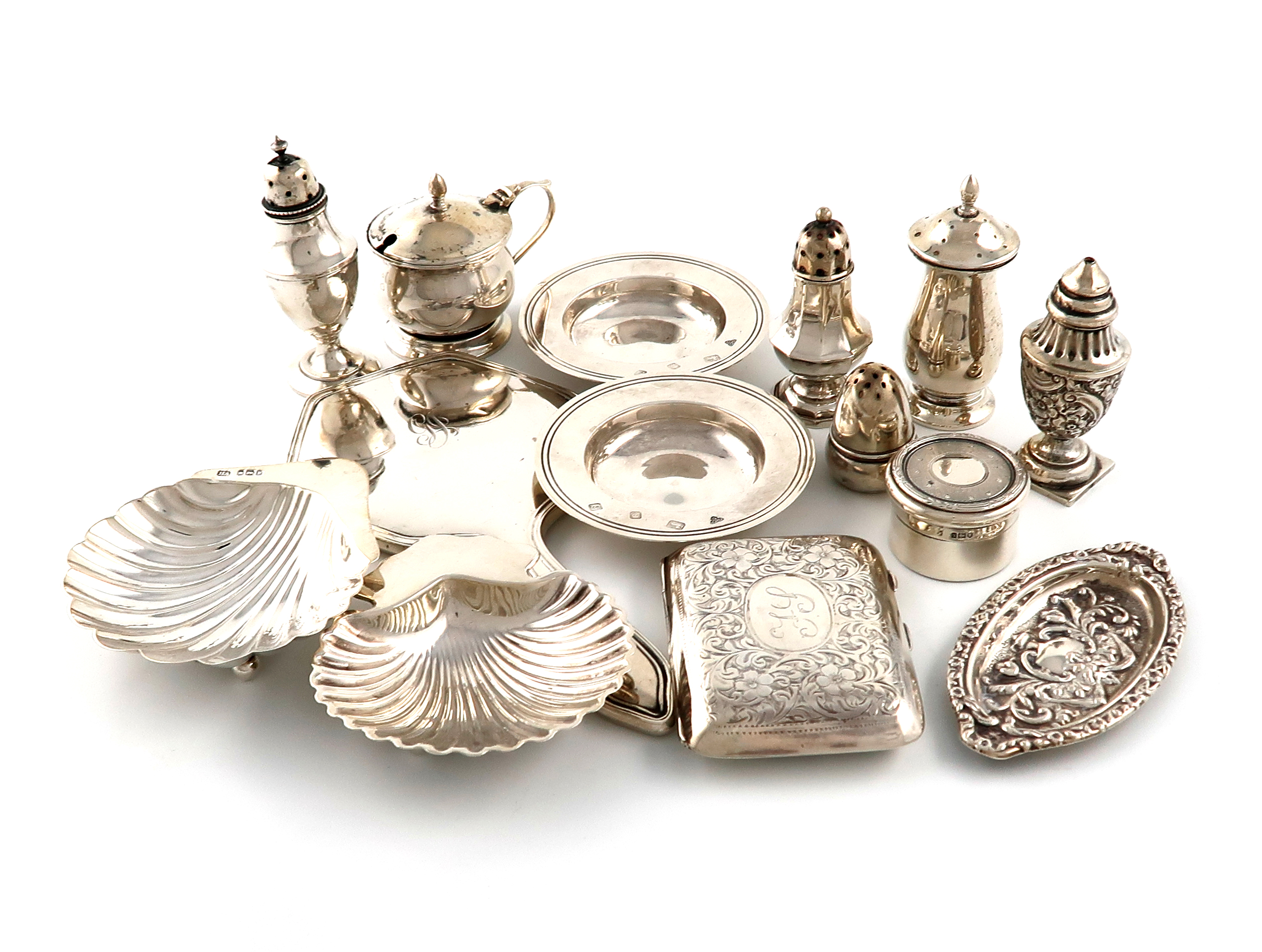 comprising: a pair of modern armada dishes, by Gibson & Co Ltd, London 1953, two shell-shaped butter dishes, Sheffield 1907 and 1915, a cigarette case, Birmingham 1912, rectangular form, engraved foliate decoration, a hand mirror, a circular dressing table pot, a modern, small oval embossed dish, plus five various salt and pepper pots and a mustard pot with blue glass liner, approx. weight 13.5oz. (13)