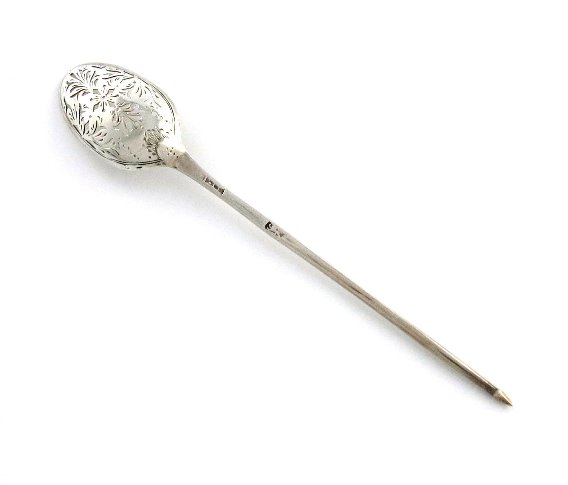 the reverse of the oval bowl with engraved decoration, the bowl pierced with stylised decoration, length 12.3cm, approx. weight 0.2oz.