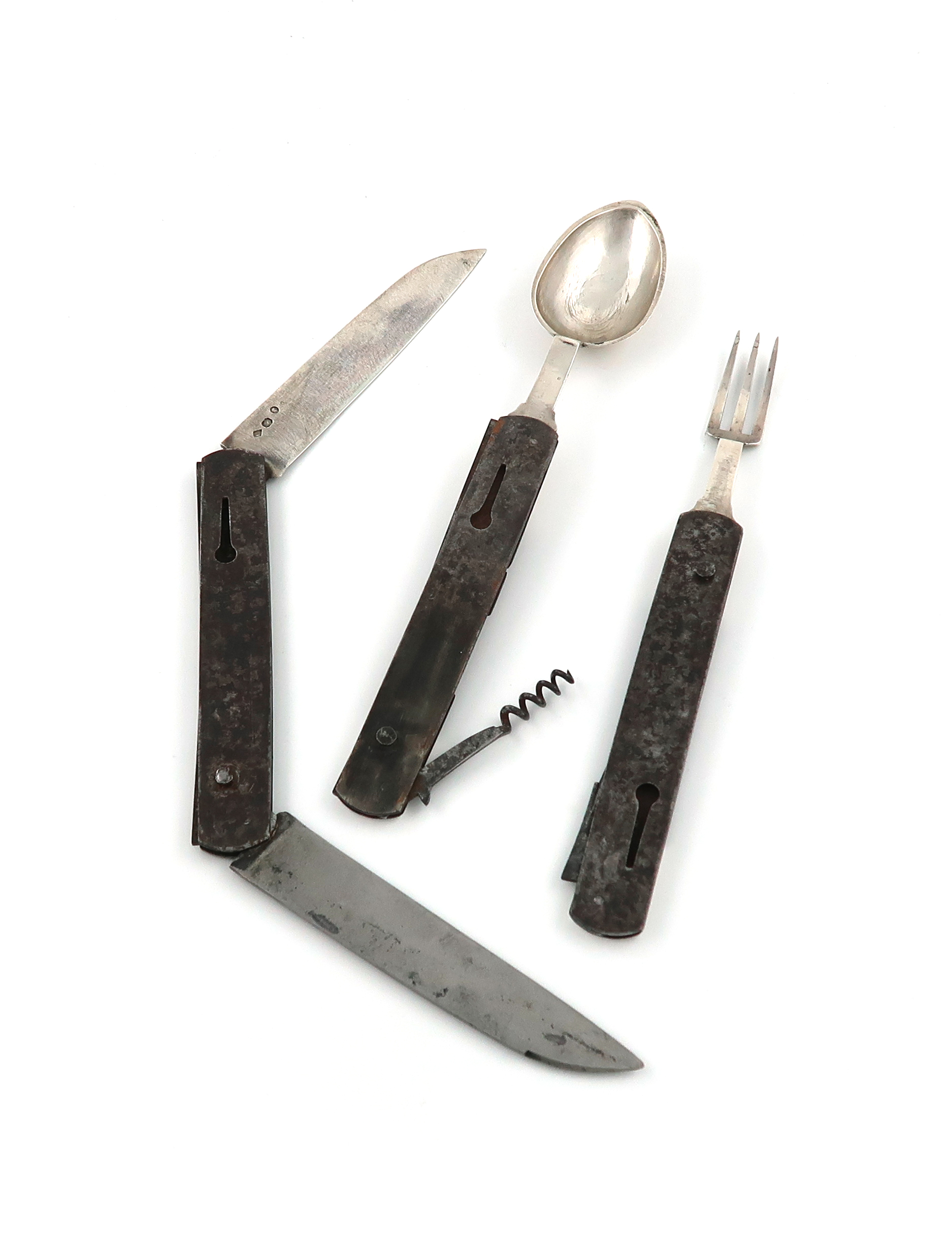 comprising a folding fork, spoon and knife, the knife with a silver blade and a steel blade, the spoon handle with a corkscrew, the three pieces clip together, with shield cartouches, length of spoon 23.7, length closed 13.8cm.