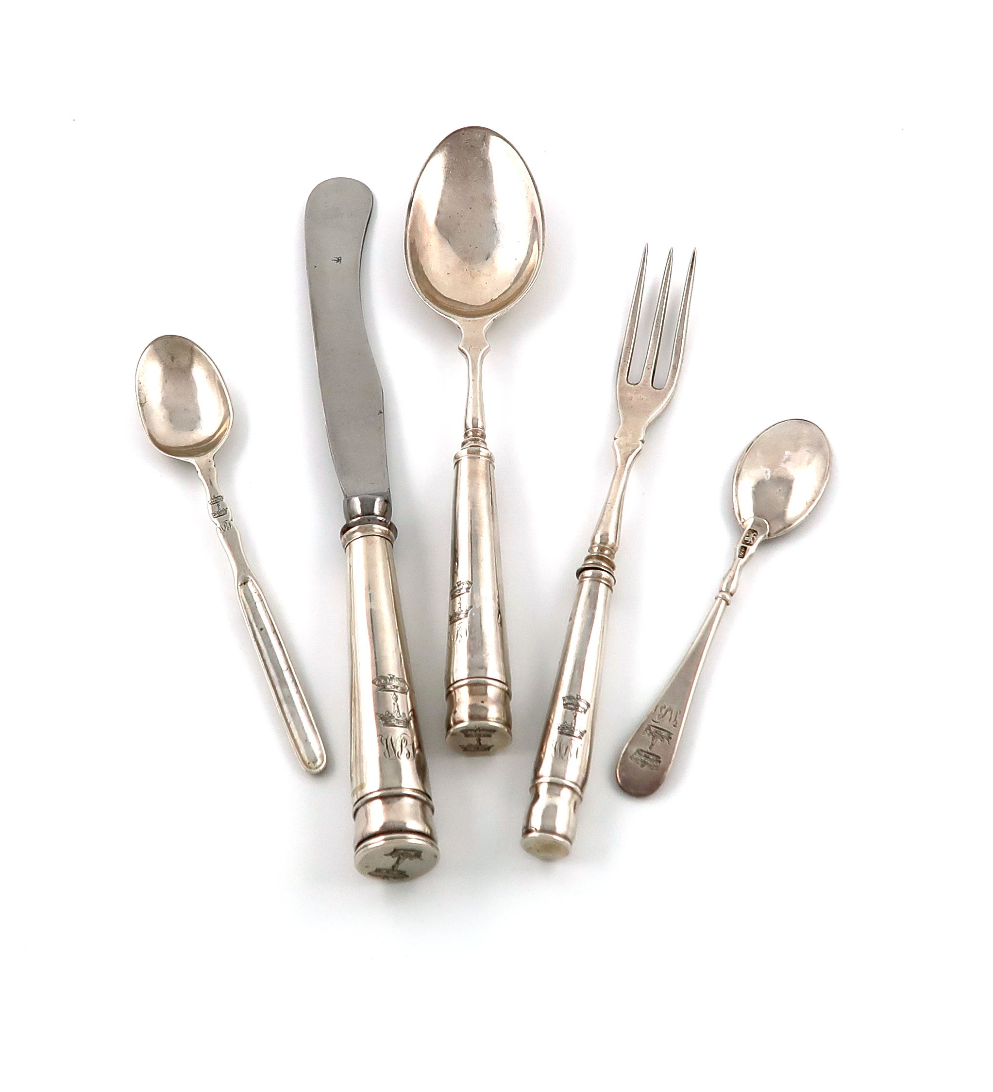 comprising: a table knife and fork, and spoon, a teaspoon and a marrow spoon, tapering hollow canon handles, with pull-off covers, engraved with a crest and initials, approx. weighable 5oz. (5)