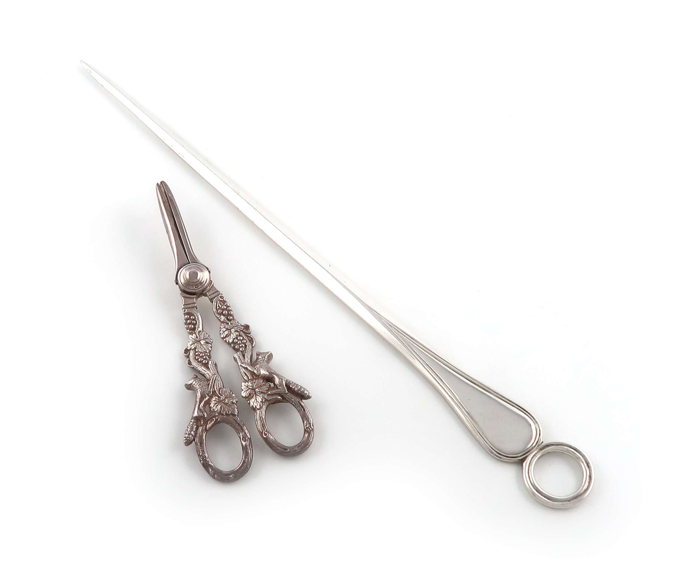 reeded ring terminal, length 36cm, plus a pair of modern grape scissors, by I. Freeman and Son, Sheffield 1964, with running fox and grapevine handles, approx. weight 8.4oz. (2)