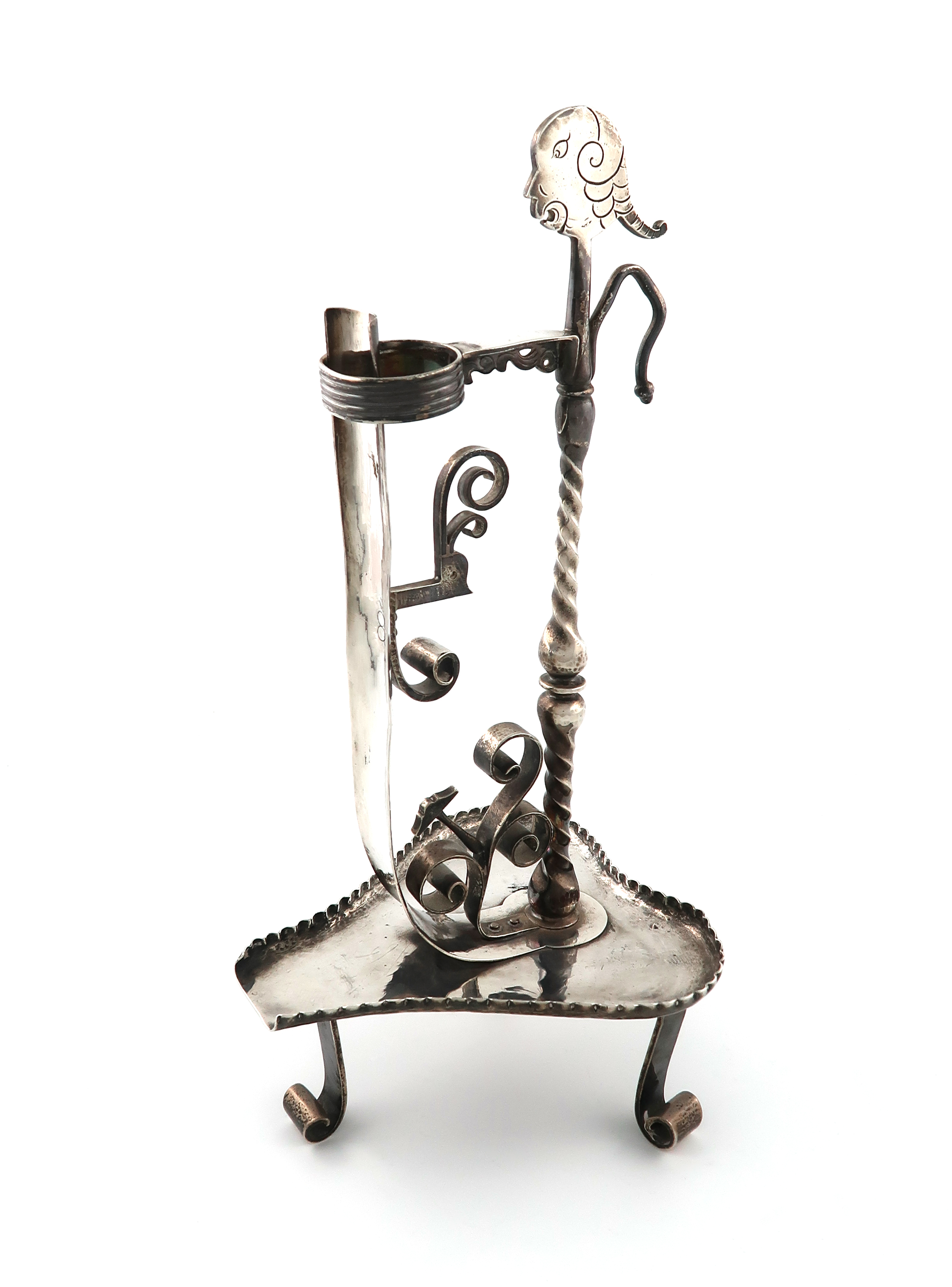 sprung candle holder with scroll motifs and mounted with a manner, the central supporting stem with a naive head and spiral baluster stem, on a shaped triangular base on three scroll feet, height 32cm, approx. weight 23oz.