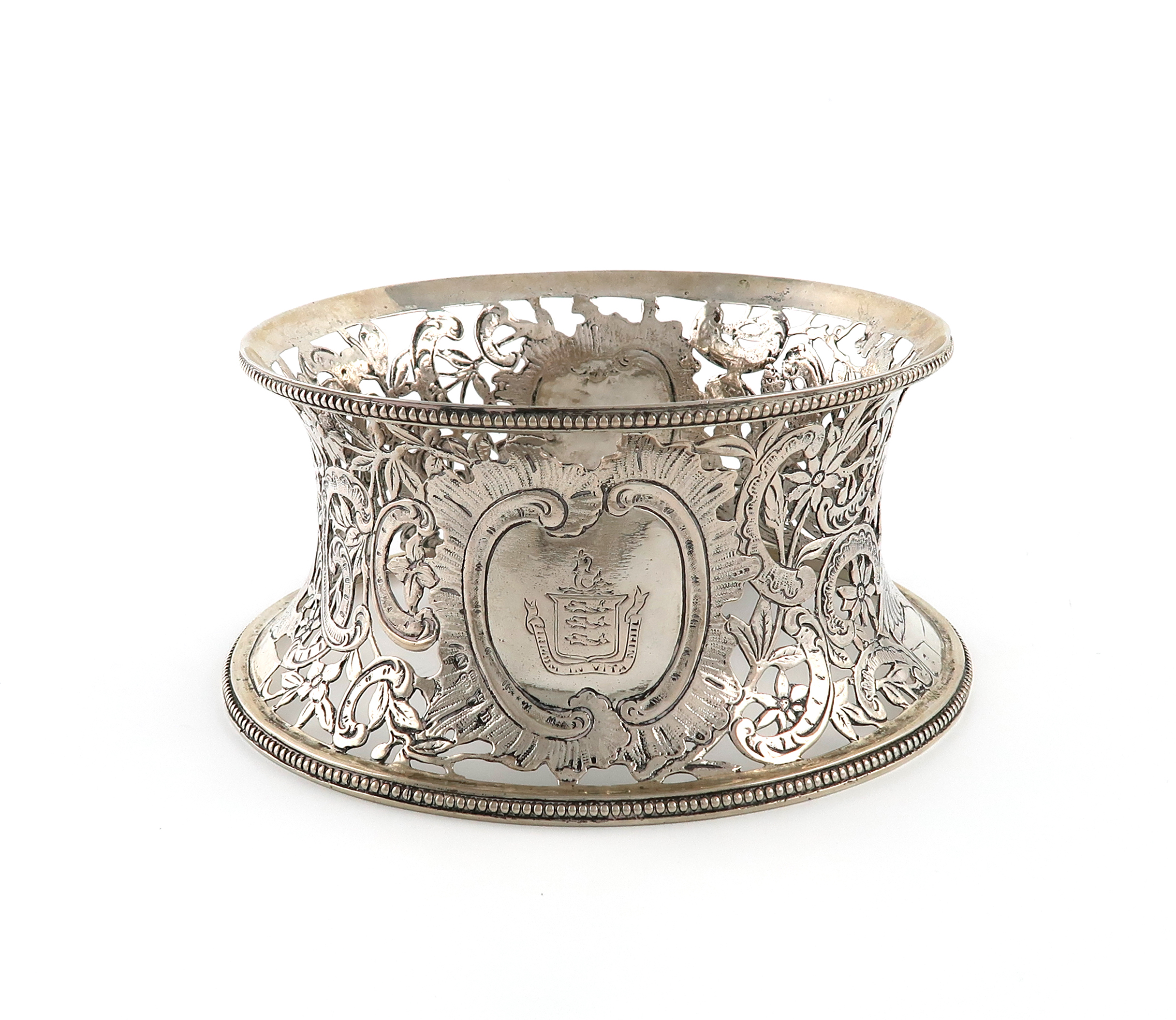 tapering circular form, pierced and chased foliate scroll and foliate estimate, with an upper and lower beaded border, engraved with a crest, the reverse with initials, diameter of base 19cm, approx. weight 14.5oz.