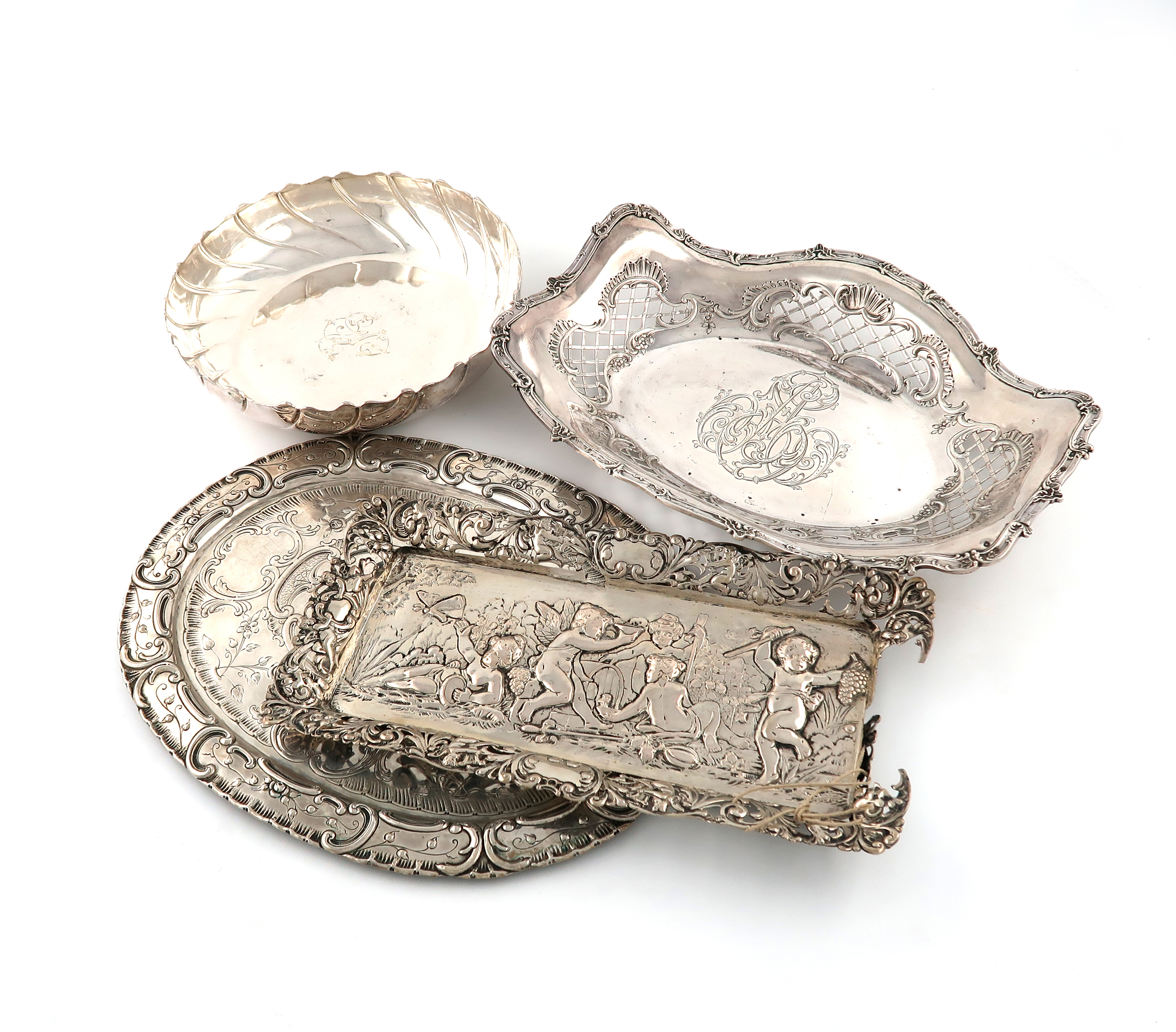 comprising: a strawberry dish of fluted circular form, the centre initialled, diameter 21.5cm, plus a shaped rectangular basket, pierced decoration, a rectangular tray with a French import mark, embossed with putti, border a.f, and a continental tray of oval form, foliate and scroll decoration, approx. total weight 49.5oz. (4)