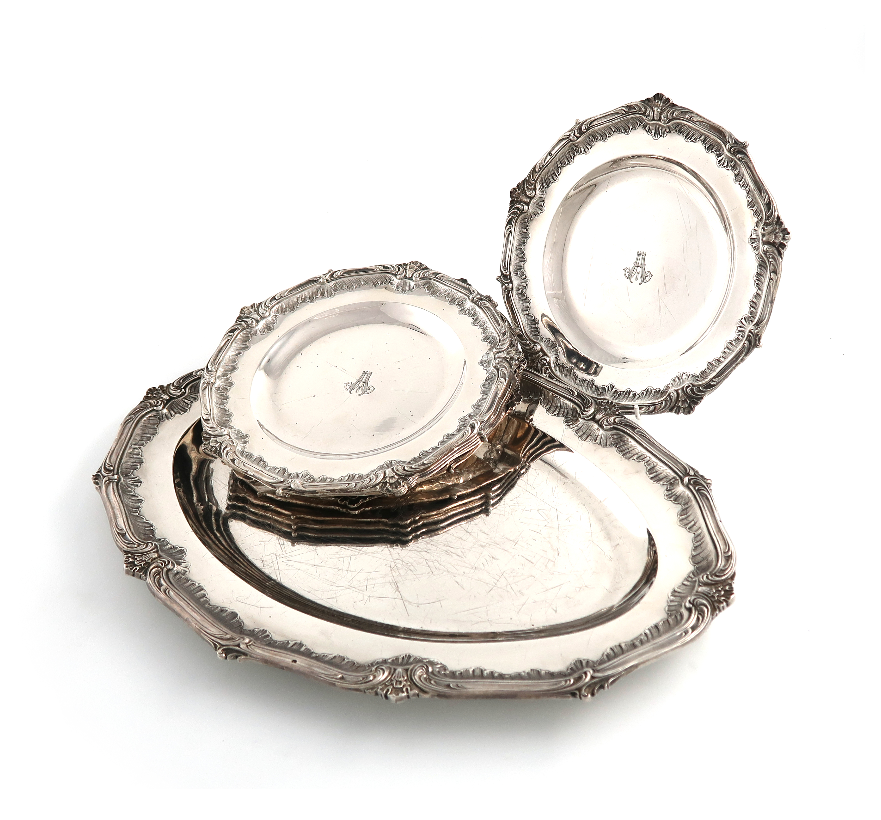 foliate scroll and rocaille borders, the centres with a monogram, the platter of oval form, the plates of circular form, length of platter 45cm, diameter of plates 23.2cm, approx. total weight 127oz. (7)