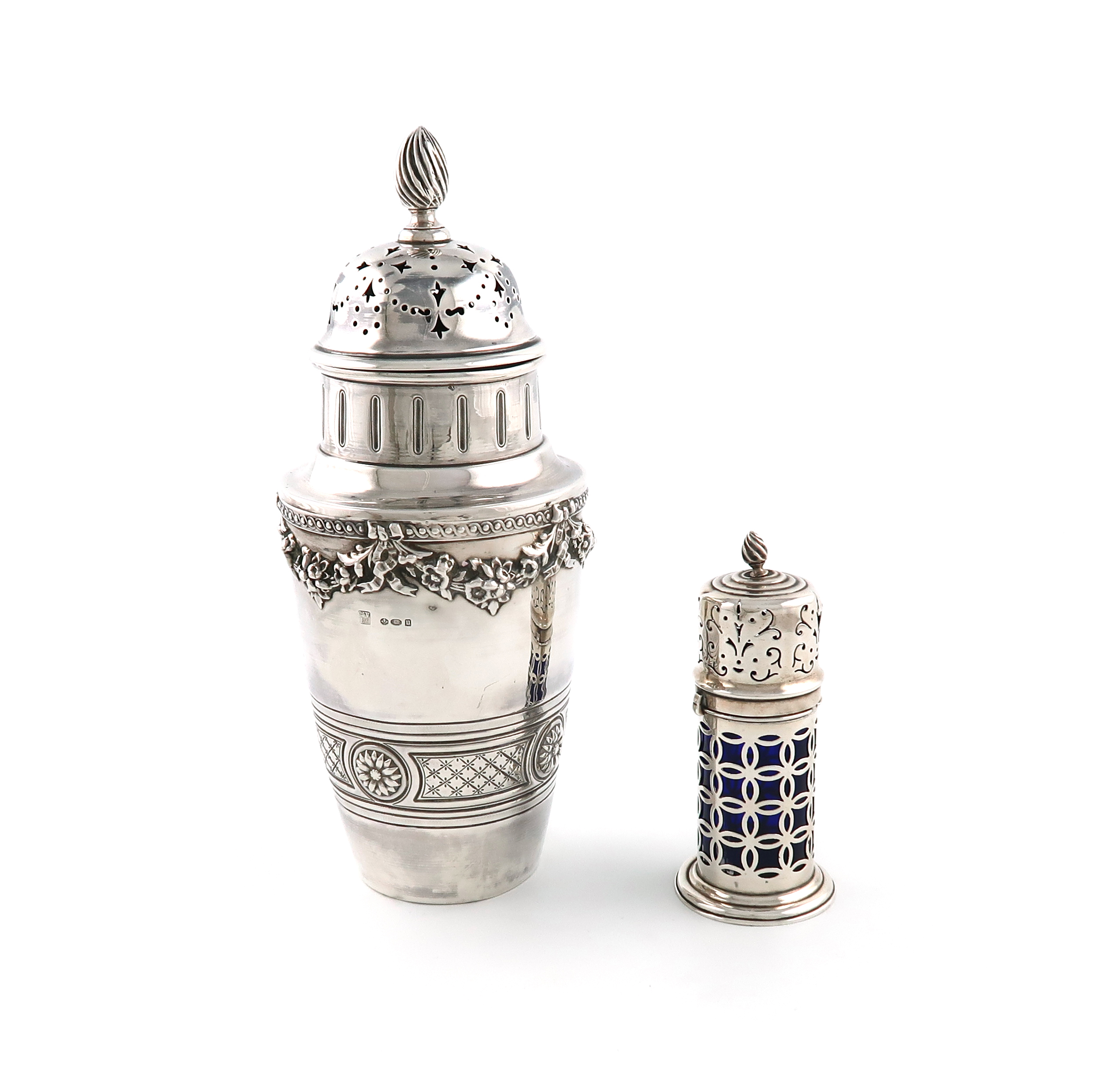 tapering circular form, foliate and rosette decoration, the pierced cover with a spiral fluted finial, height 20.5cm, plus a silver pepper pot, Chester 1904, approx. weight 9oz. (2)